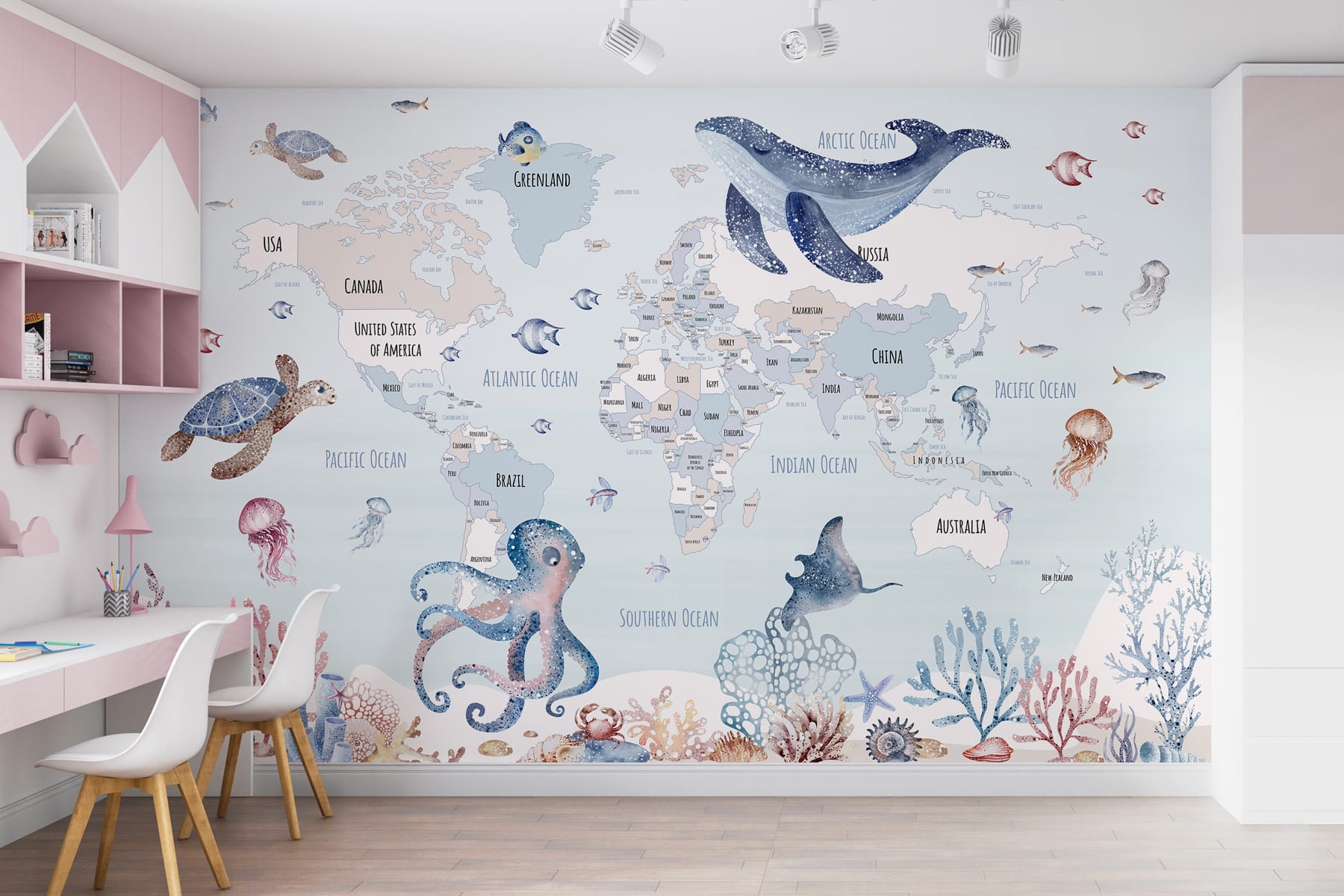 Transform any space with this whimsical mural that blends the grandeur of a world map with the charm of sea creatures. Imagine little explorers in a room filled with turtles, playful octopuses, and sweet jellyfish dancing around. It’s not just decor; it’s like a gentle nudge to spark curiosity about oceans and far-off lands. The soft colors create a calming vibe, perfect for kids’ rooms or play areas. Plus, can’t you just picture the conversations? “Look, that’s where we went on vacation!” Adventure lives here—right on the walls!