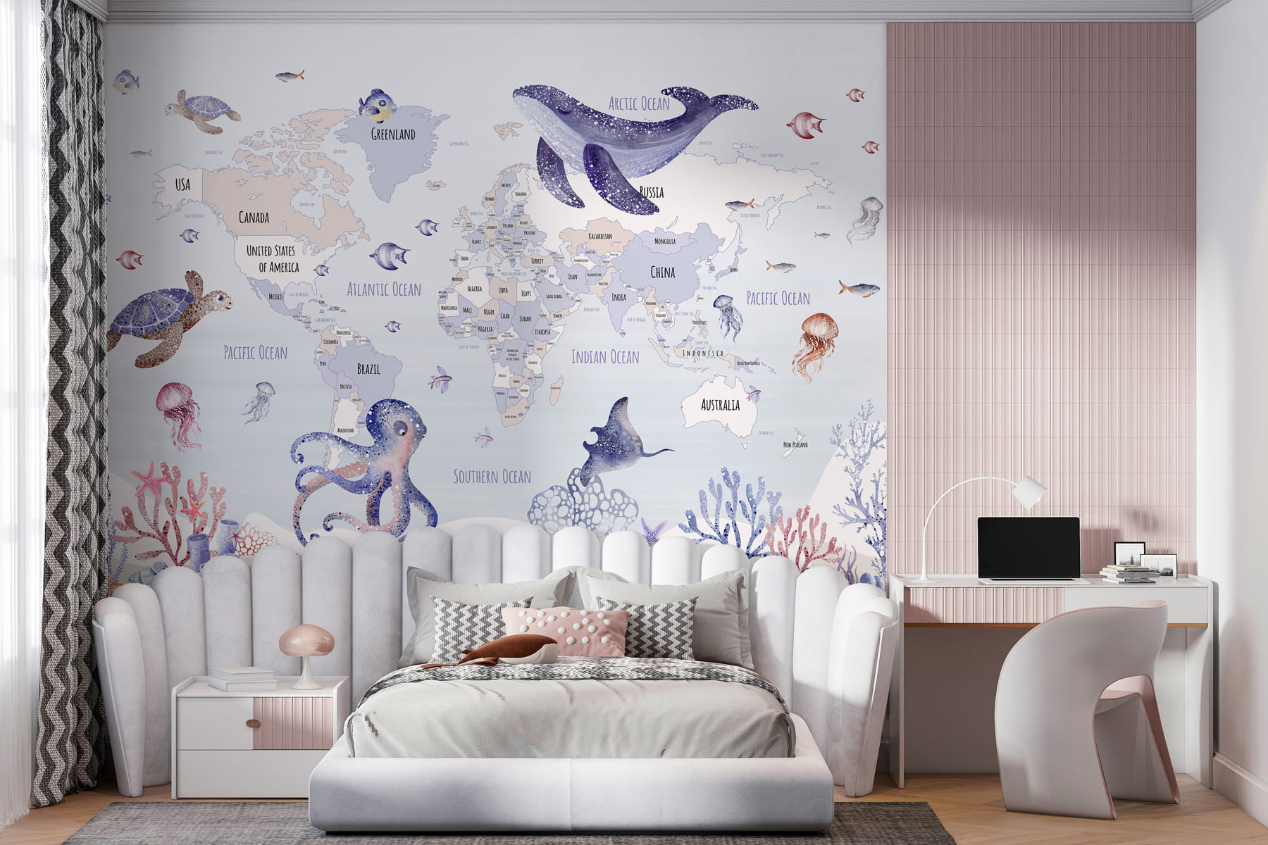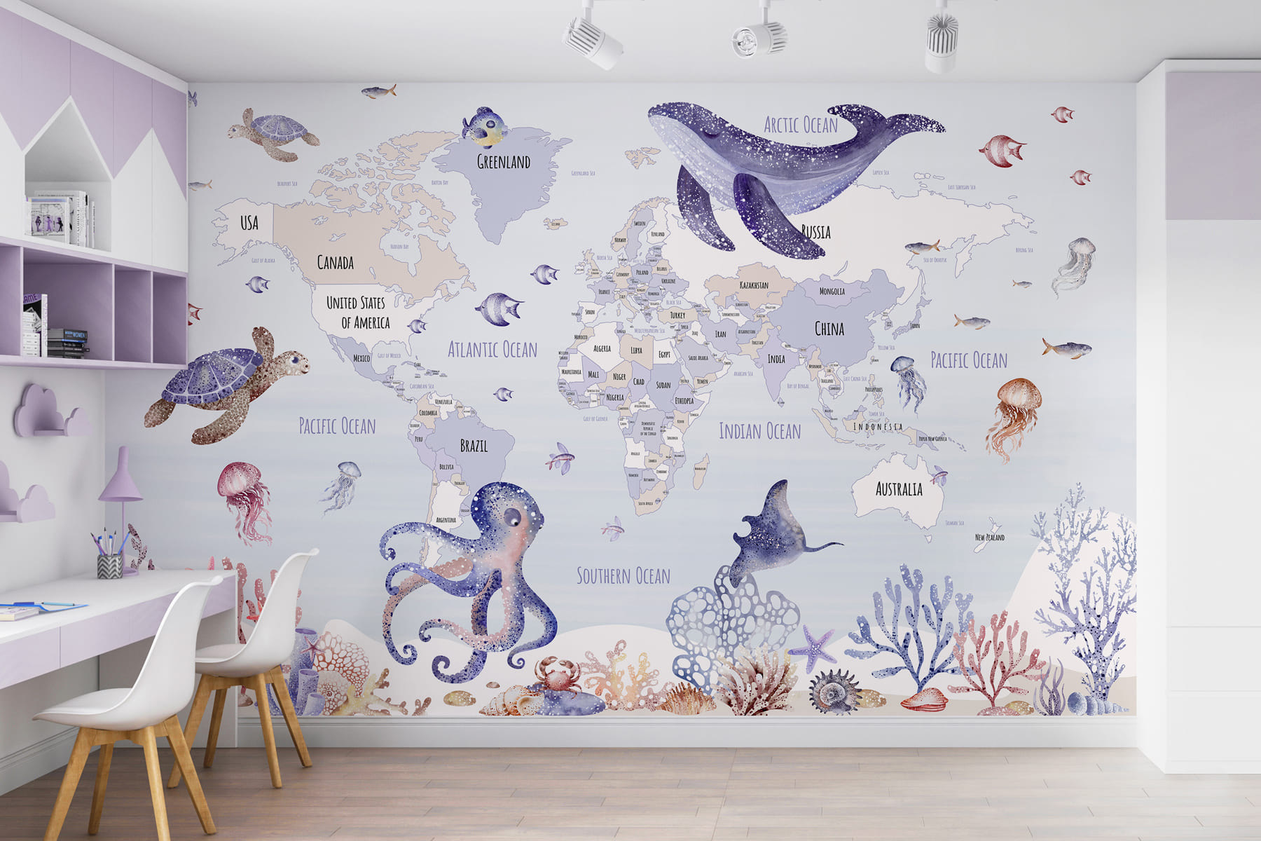Transform your child’s space with this delightful wall mural featuring a colorful map of the world, complete with fun sea creatures. Picture a curious little explorer standing before octopuses, jellyfish, and turtles, dreaming of ocean adventures while learning about different countries. This mural adds a splash of whimsy and wonder, making it perfect for playrooms or nurseries. The soothing colors make it easy on the eyes, inviting sweet daydreams and inspiring future explorers. Watch as the room comes alive; it’s like having the ocean right at home!