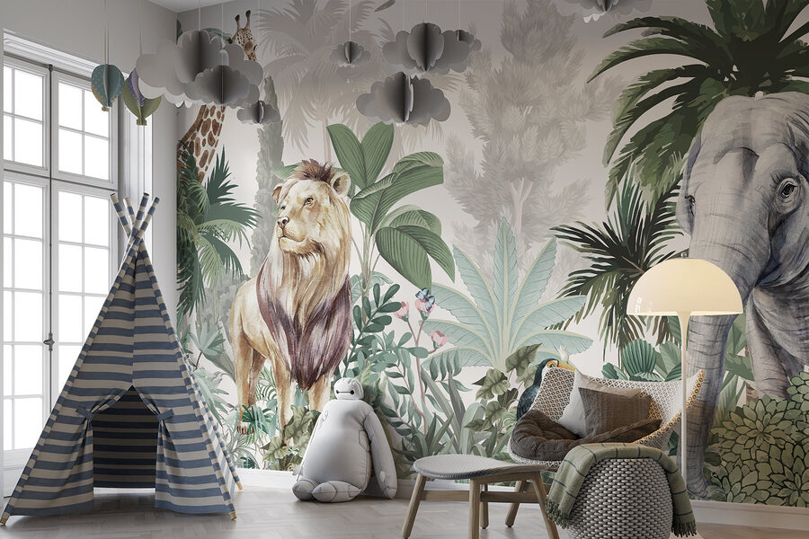 Transform your space into a vibrant jungle with this stunning wall mural. Imagine walking into a room where a majestic lion and a wise elephant are your new wall buddies, framed by lush greenery and chirping birds. It’s like having a mini safari right in your home! Each glance brings a touch of nature indoors, rustling up a sense of calm and adventure. Perfect for a cozy living area or a playroom that sparks imagination, this mural adds a splash of charm. Just think—you might even catch yourself daydreaming of far-off places while lounging on the couch. What a way to escape, right? Let the wild inspire your everyday!