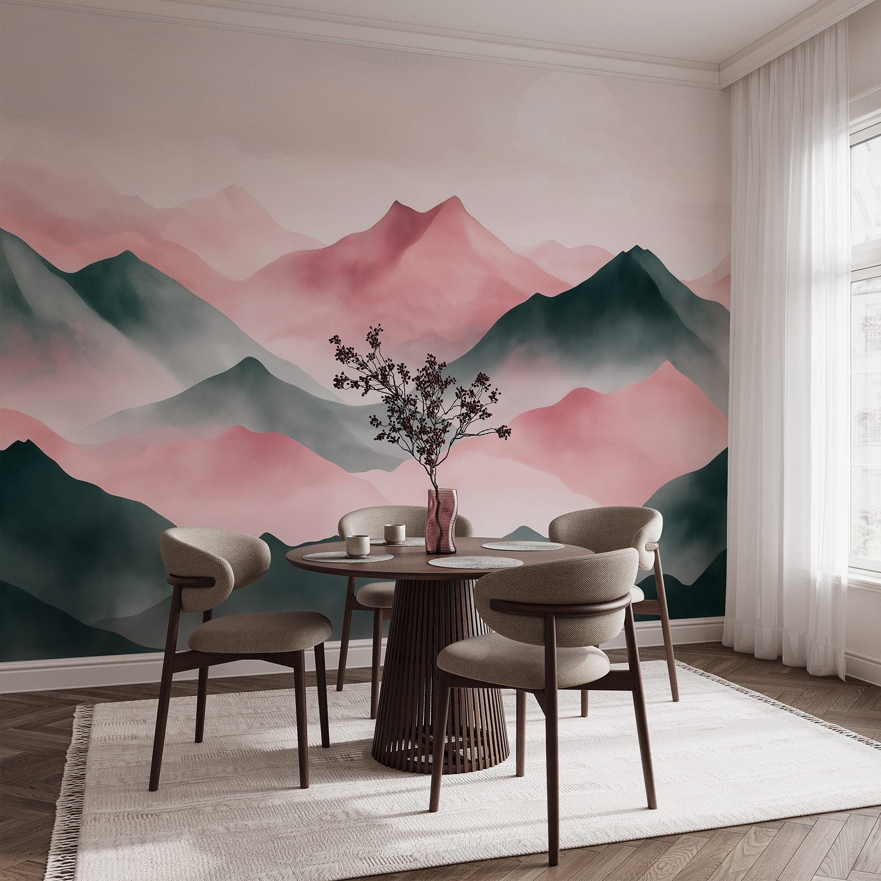 Transform your space with this dreamy wall mural featuring a misty mountain range, bathed in soft pinks and muted tones. It’s like bringing a serene sunrise right into your home, minus the early wake-up call. Imagine sipping coffee while gazing at these gentle peaks, feeling a tranquil escape each time you walk by. This mural adds a relaxing vibe to any room—perfect for a cozy den, a bright bedroom, or even that little reading nook that needs a touch of magic. It’s an easy way to make walls pop and conversations flow. Who knew a mural could spark daydreams so effortlessly?