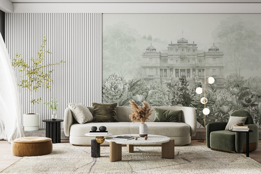 Transform your space with a mural that whispers elegance and charm. This stunning design showcases a grand building nestled among a lush floral backdrop, conjuring the feel of an enchanting garden party. Imagine your guests strolling into a storybook scene, where flowers burst forth in soft greens and whites, almost inviting touch. It’s like bringing the outdoors in—without the pollen! Perfect for a living room or an inspiring workspace, this mural can spark conversations and daydreams. A few peonies might just be the secret to a happier home!