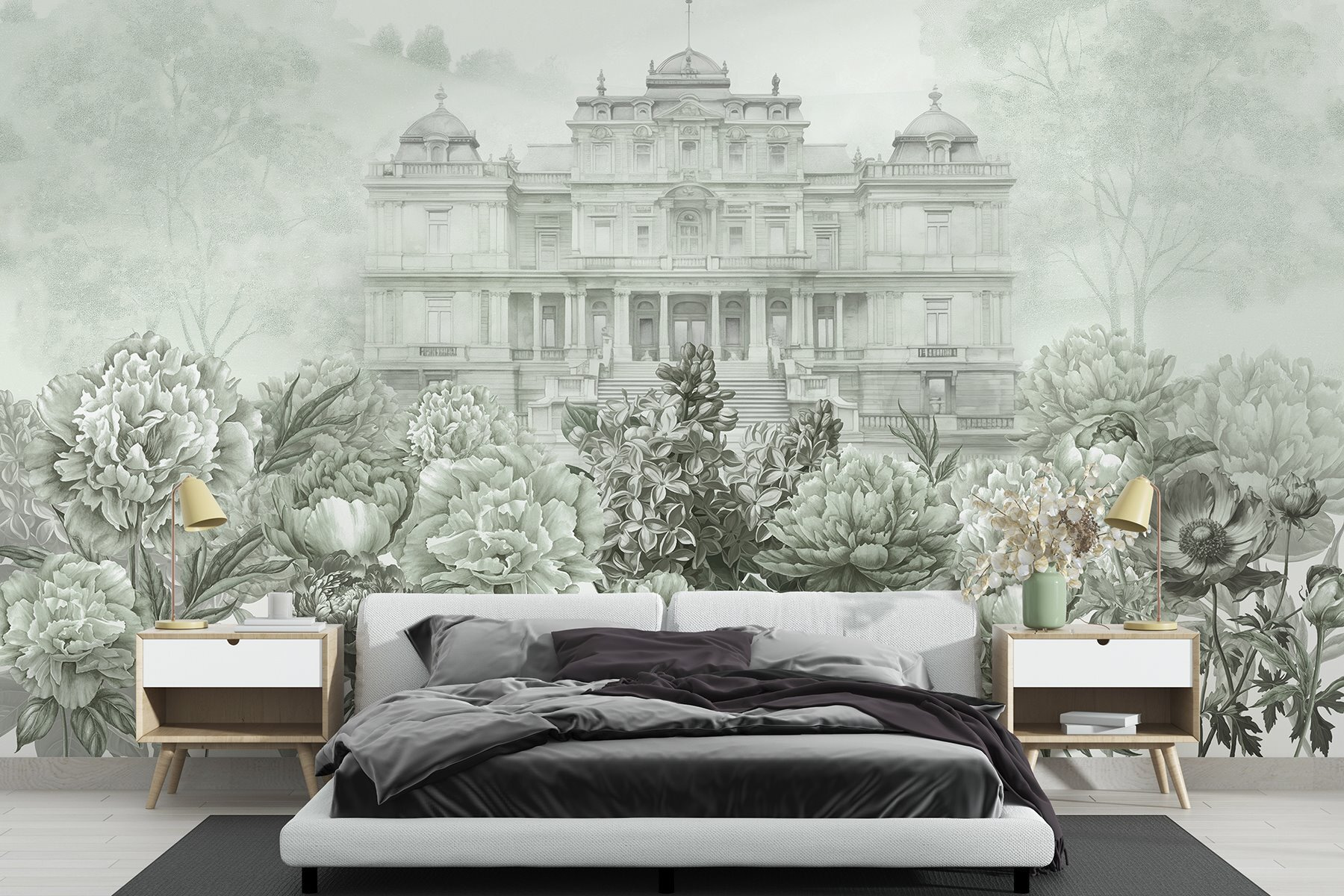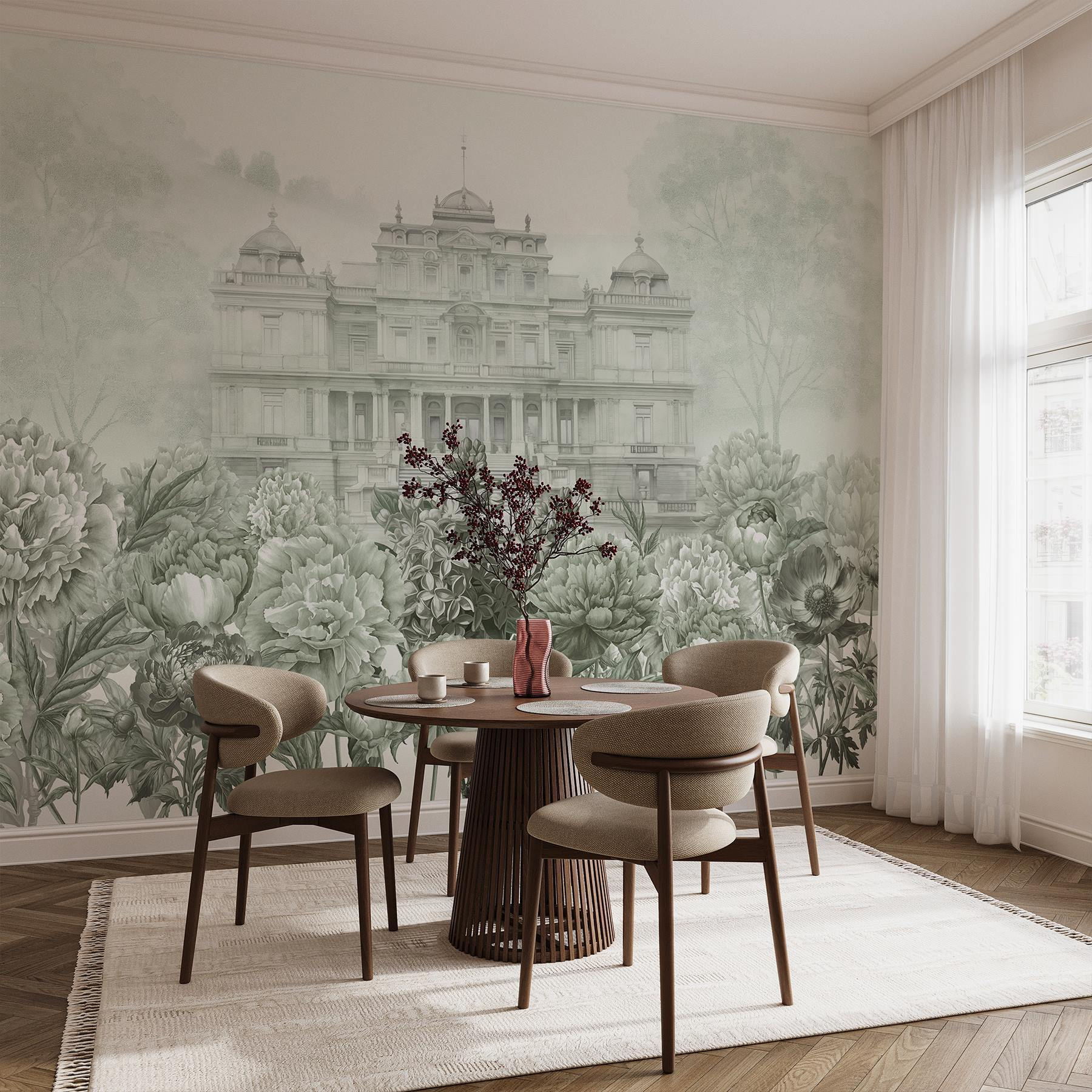 Transform your space with a mural that whispers elegance and charm. This stunning design showcases a grand building nestled among a lush floral backdrop, conjuring the feel of an enchanting garden party. Imagine your guests strolling into a storybook scene, where flowers burst forth in soft greens and whites, almost inviting touch. It’s like bringing the outdoors in—without the pollen! Perfect for a living room or an inspiring workspace, this mural can spark conversations and daydreams. A few peonies might just be the secret to a happier home!