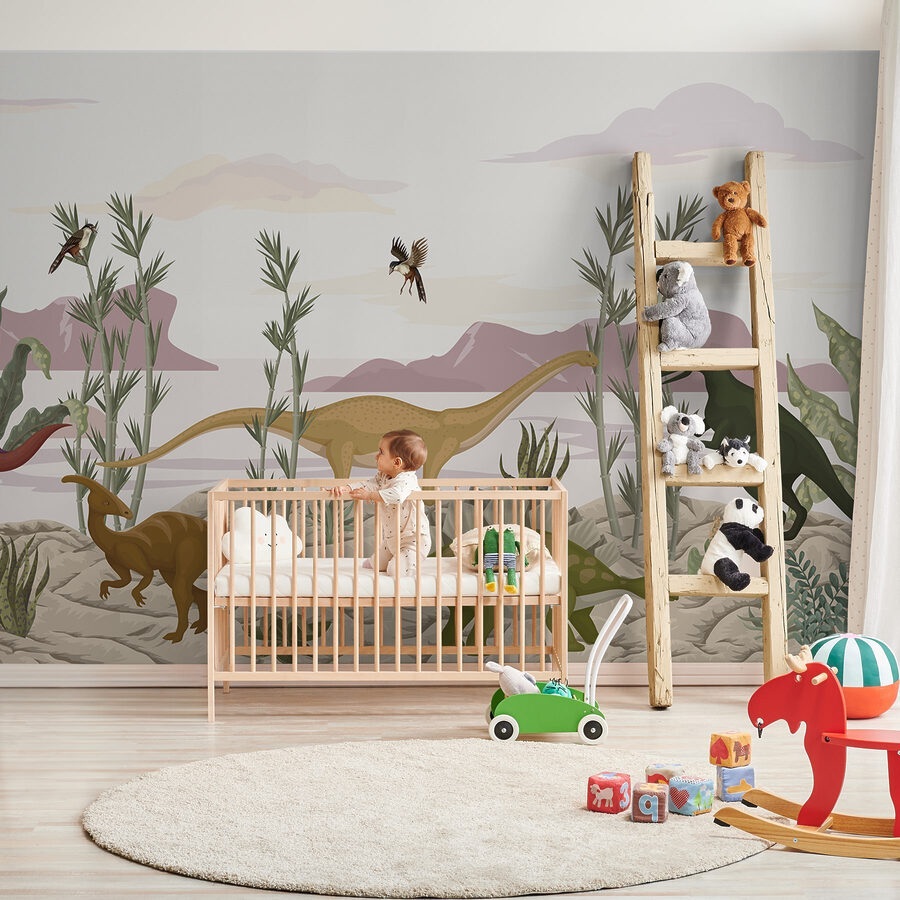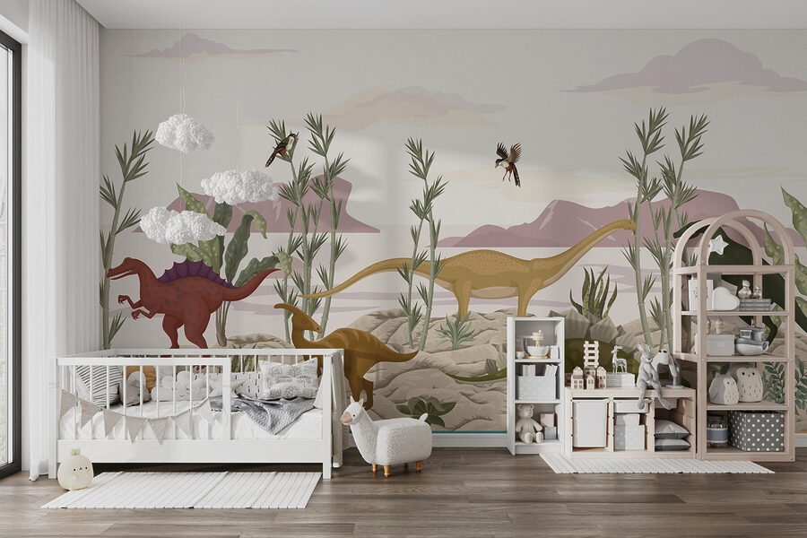 Transform any room into a prehistoric paradise with this delightful mural featuring a group of dinosaurs in a sunny desert landscape. Imagine stepping into your space and feeling a wave of adventure wash over you, as those gentle giants roam among lush plants and distant mountains. The colors are soft yet vibrant, adding a unique flair without overpowering the room. Perfect for kids’ rooms, playrooms, or even a quirky living area—this mural will spark imaginations and bring a smile to everyone’s face. Who wouldn’t want a friendly T-Rex keeping watch over their family? It’s a piece that’ll make you feel like you’re wandering into a world of wonder every day.