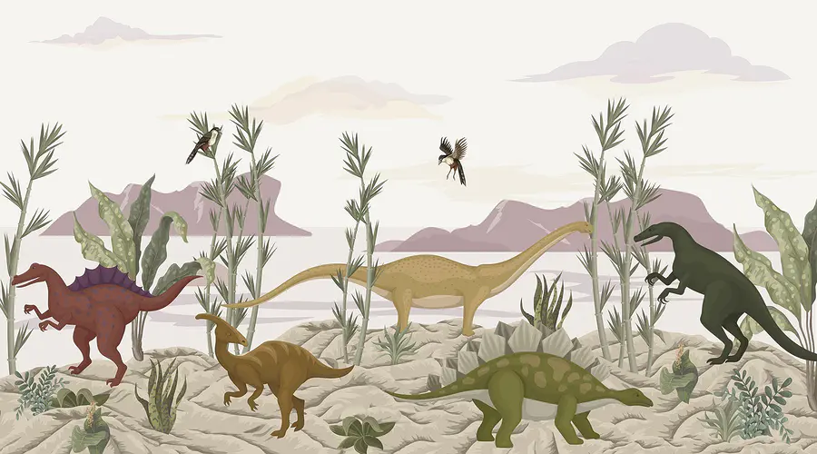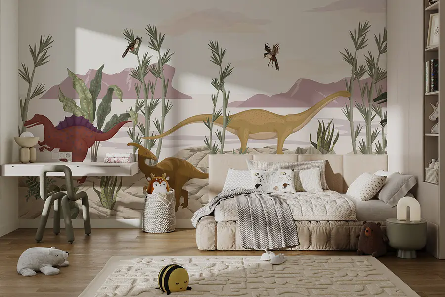Transform any room into a prehistoric paradise with this delightful mural featuring a group of dinosaurs in a sunny desert landscape. Imagine stepping into your space and feeling a wave of adventure wash over you, as those gentle giants roam among lush plants and distant mountains. The colors are soft yet vibrant, adding a unique flair without overpowering the room. Perfect for kids’ rooms, playrooms, or even a quirky living area—this mural will spark imaginations and bring a smile to everyone’s face. Who wouldn’t want a friendly T-Rex keeping watch over their family? It’s a piece that’ll make you feel like you’re wandering into a world of wonder every day.