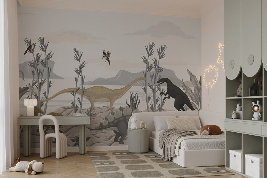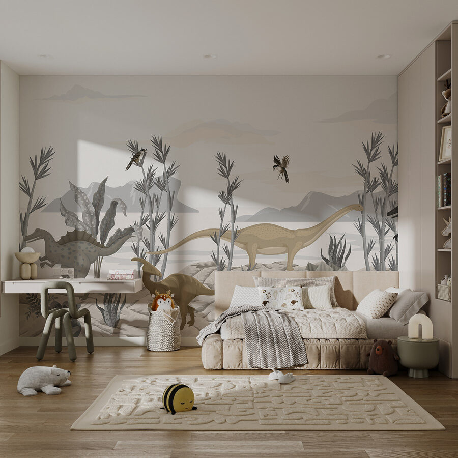Transform any room into a Jurassic adventure with this mural that bursts with prehistoric charm. Imagine little ones waking up to dinosaurs casually hanging out in a desert landscape—talk about a morning mood boost! The gentle hues and playful designs keep things fun without overwhelming the senses. Parents can easily picture storytime taking place beneath the watchful eyes of friendly dino pals. It’s like stepping into a world where imagination reigns. Perfect for creating a cozy nook for reading, playtime, or just dreaming big. Who wouldn’t want to hang out here?