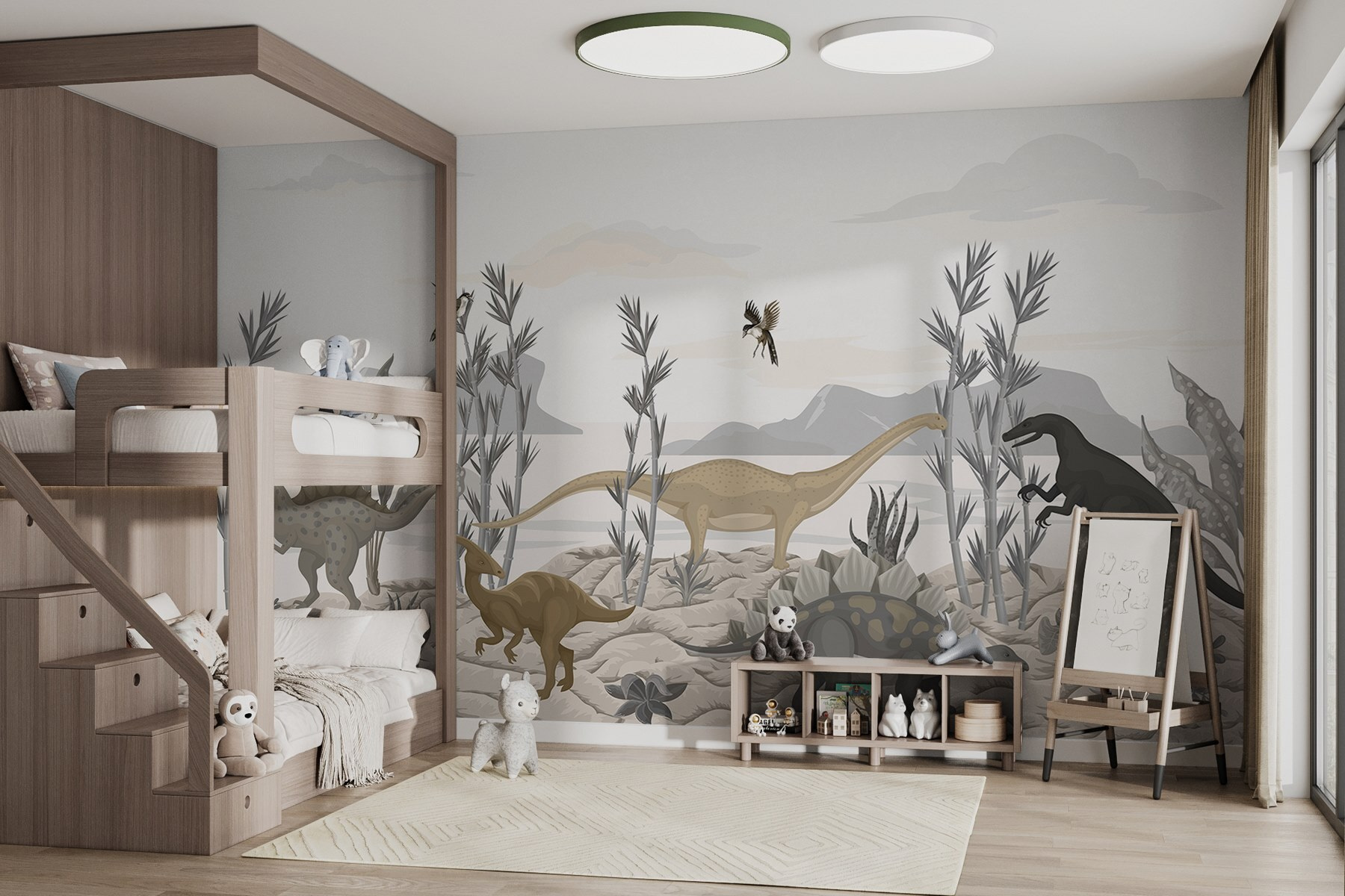 Transform any room into a Jurassic adventure with this mural that bursts with prehistoric charm. Imagine little ones waking up to dinosaurs casually hanging out in a desert landscape—talk about a morning mood boost! The gentle hues and playful designs keep things fun without overwhelming the senses. Parents can easily picture storytime taking place beneath the watchful eyes of friendly dino pals. It’s like stepping into a world where imagination reigns. Perfect for creating a cozy nook for reading, playtime, or just dreaming big. Who wouldn’t want to hang out here?
