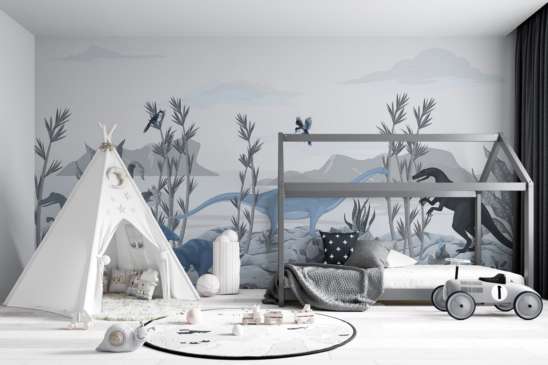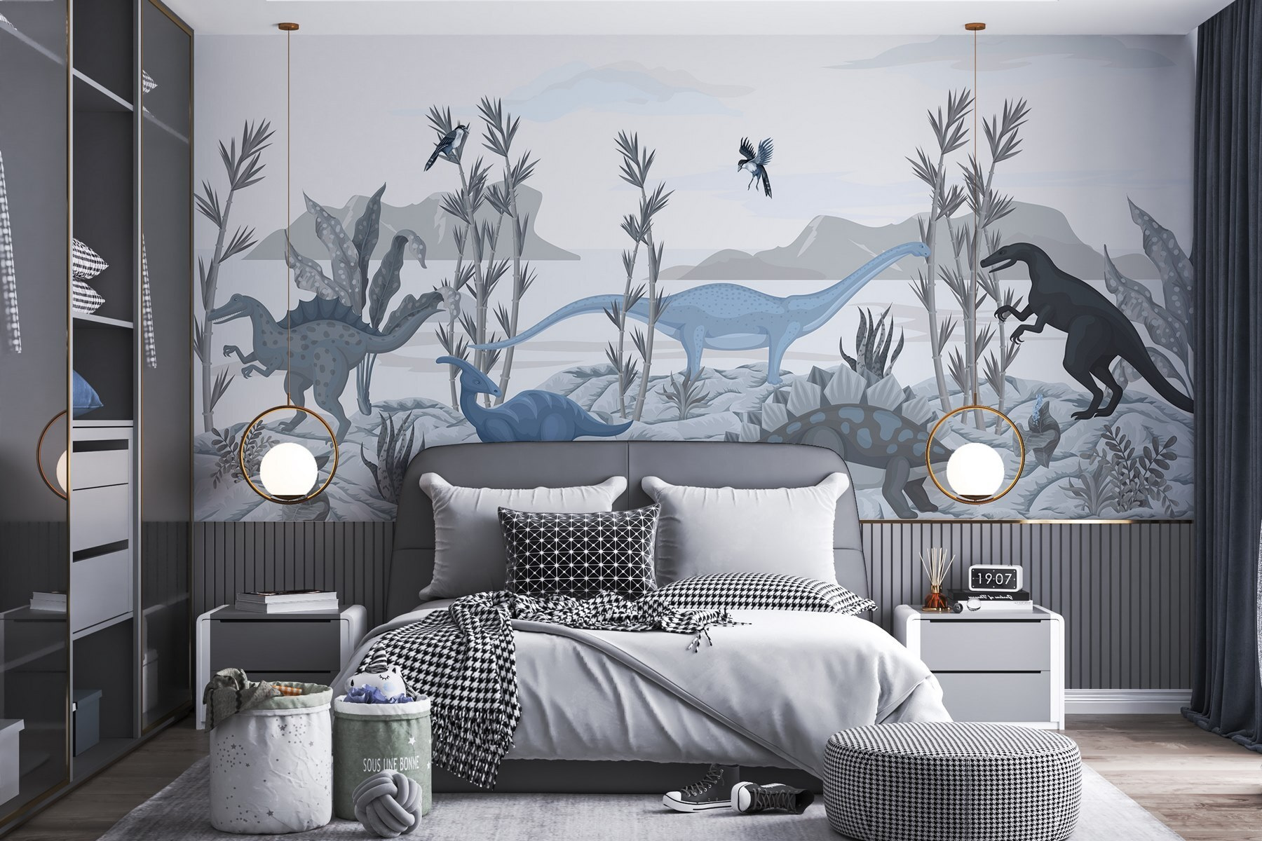 Transform any kid’s space into a prehistoric paradise with this stunning wall mural featuring a group of dinosaurs exploring a lush landscape. Imagine little ones gazing up at friendly brontosauruses, playful stegosauruses, and a fierce velociraptor, all while letting their imaginations run wild. It’s like stepping straight into a dino adventure without the noise of a T-Rex. The gentle colors create a calming vibe, perfect for bedtime stories or creative play. Add a touch of whimsy to any room, and watch as the excitement unfolds. Who knew dinosaurs could be such great roomies?