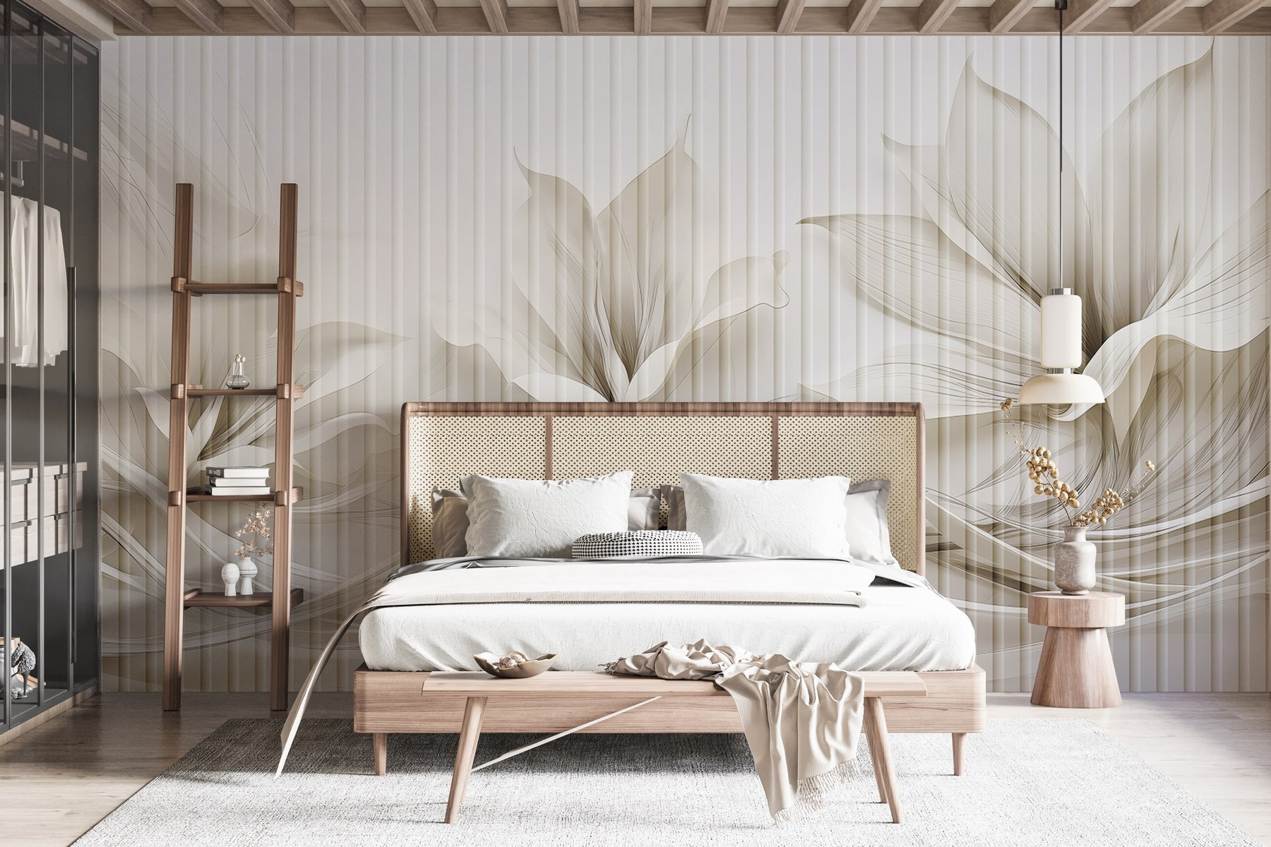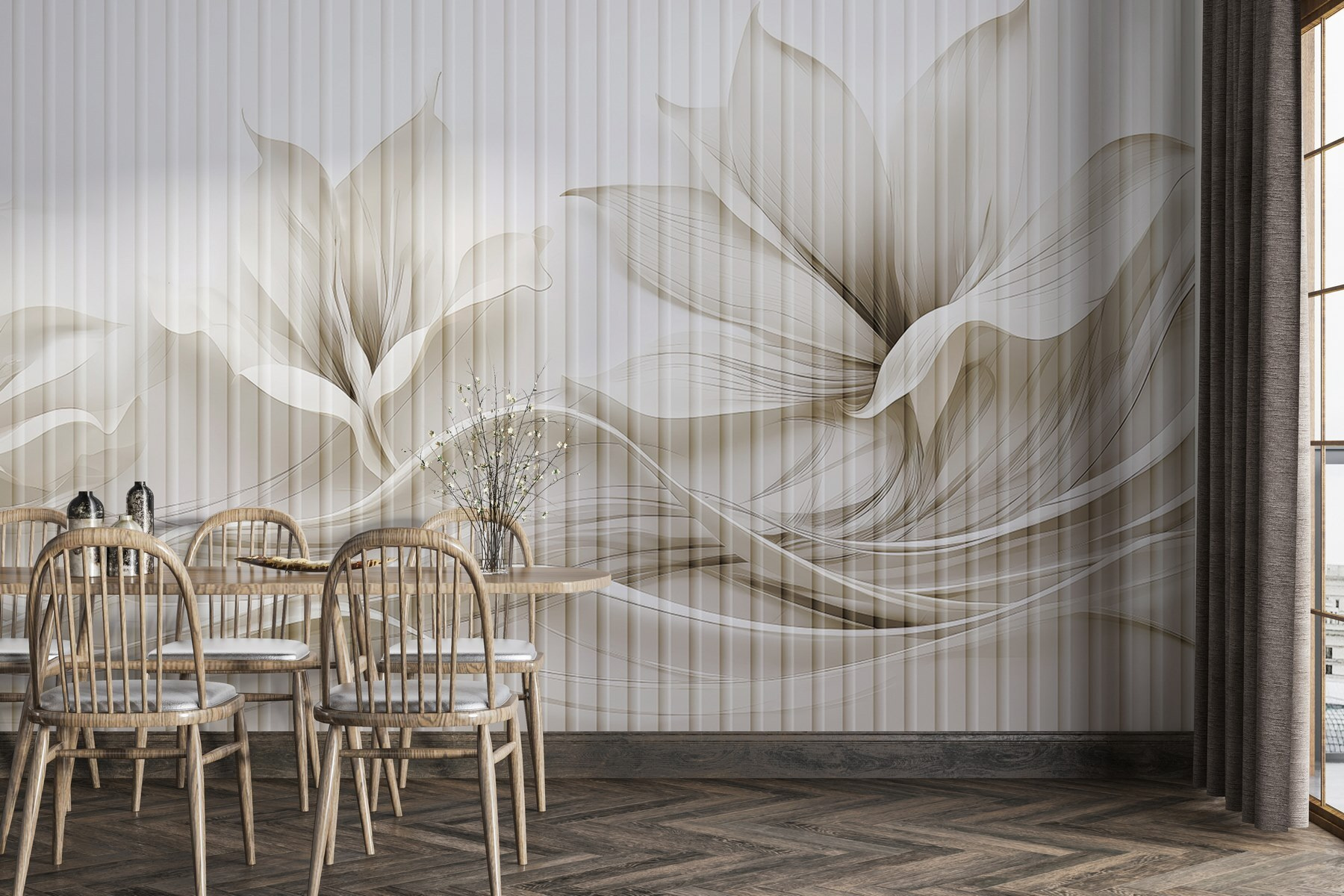 Transform your space with this stunning wall mural featuring an elegant floral design that dances with flowing lines. Imagine stepping into a serene oasis every time you enter the room—a gentle reminder of nature’s beauty, without needing to water any plants. The soft hues and graceful patterns create a calming atmosphere, perfect for a cozy reading nook or a lively dining area. Friends might just mistake it for a fancy art installation and ask where you found it. Whether you’re hosting or simply unwinding after a long day, this mural adds that touch of sophistication, inviting warmth and creativity into your home. Who knew a wall could make such a splash?