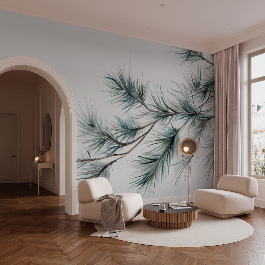 Transform your space with this mural featuring delicate pine branches in soothing hues. Imagine waking up to a serene scene that feels like a walk in a peaceful forest, where every glance reminds you to breathe easy and embrace the calm. It’s not just decor; it captures those soft whispers of nature, inviting a sense of tranquility into any room. Friends might lean in for a closer look, admiring how it dances with the light throughout the day. Perfect for cozy corners or brightening up a blank wall—who wouldn’t want a slice of the outdoors right at home?