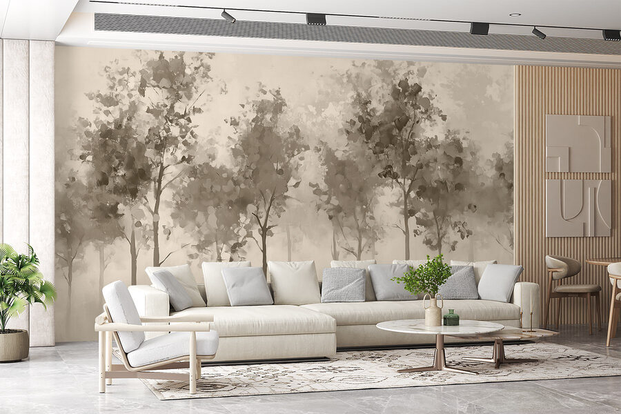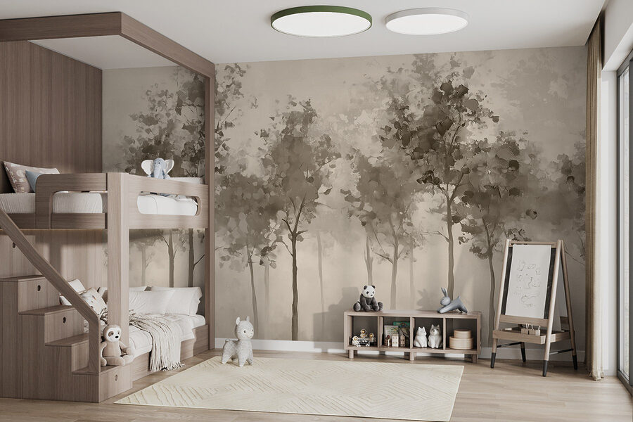 Transform a wall into a serene retreat with this enchanting mural of trees emerging from a gentle fog. It effortlessly brings the calming essence of nature right into your space, perfect for those days when a bit of peace is necessary. Picture lounging in your favorite chair, a warm cup of tea in hand, as soft light filters through those dreamy trunks. The earthy colors merge beautifully, allowing your room to breathe while adding a touch of sophistication without being too stuffy. It’s like having a quiet forest escape, right in your home—now, who wouldn’t want that?