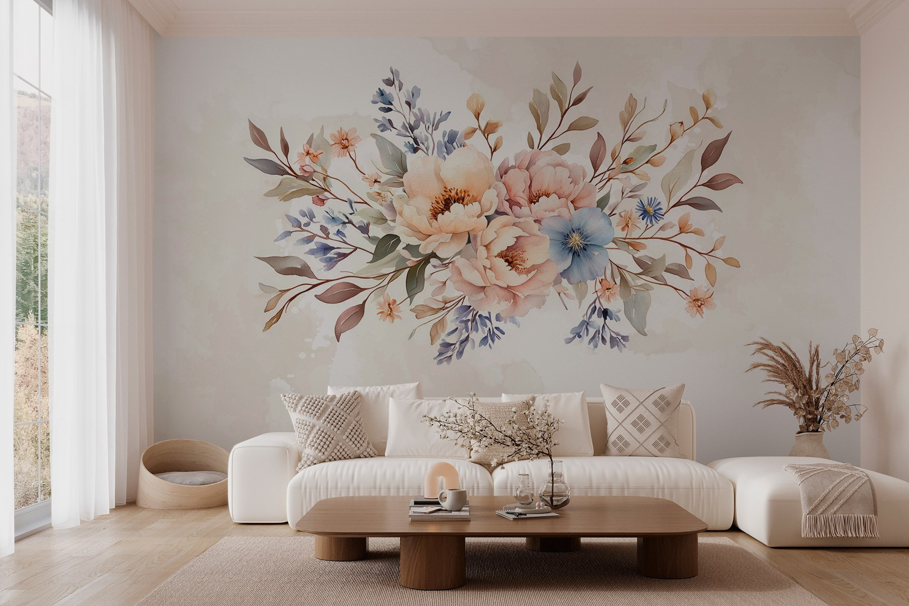 Brighten up any space with this enchanting wall mural featuring a bouquet of flowers on a soft white background. It’s like having a little garden in your home without the need for watering or pesky bees. The peonies and dainty blossoms practically invite daydreams or quiet moments with a cup of tea. Imagine stepping into your room and feeling that instant cheer from the vibrant colors, like springtime even in midwinter. Perfect for a cozy corner or a statement wall, this mural effortlessly brings warmth and charm, making any room feel just a bit more magical.