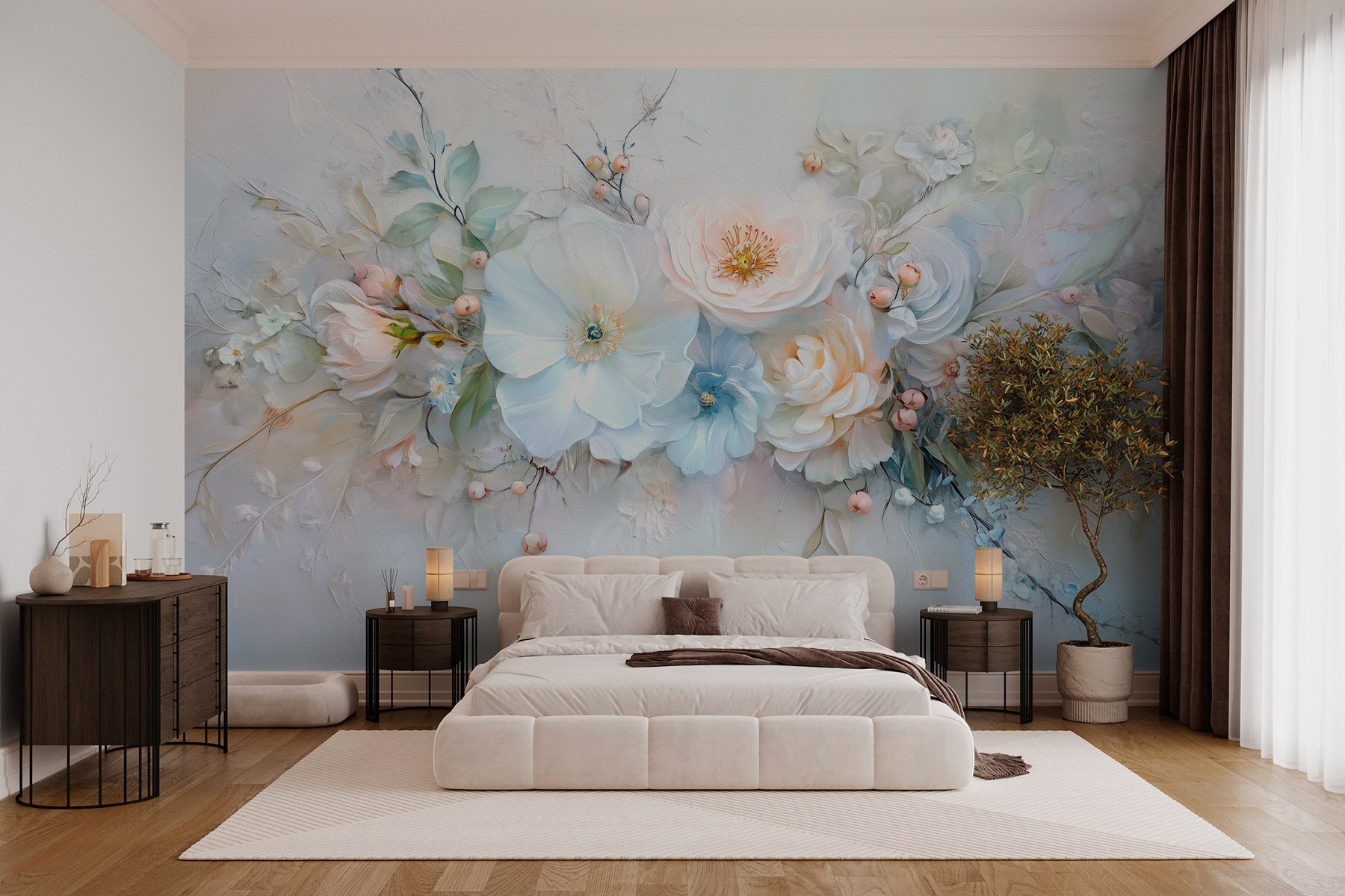 Picture this: a wall bursting with soft blooms and delicate leaves, a vibrant embrace of nature right in your living space. This wall mural isn’t just a decoration; it’s an invitation to breathe easy. Each petal seems to whisper secrets of spring, while those gentle blues and pinks create a serene backdrop. Imagine sipping your morning coffee, simply gazing at this floral wonder, ready to tackle the day. It really makes any room feel more alive—like sunshine turned into art. Seriously, who wouldn’t want to dream among flowers? It’s cheerful, it’s inviting, and it’s perfect for adding that touch of beauty everyone craves.