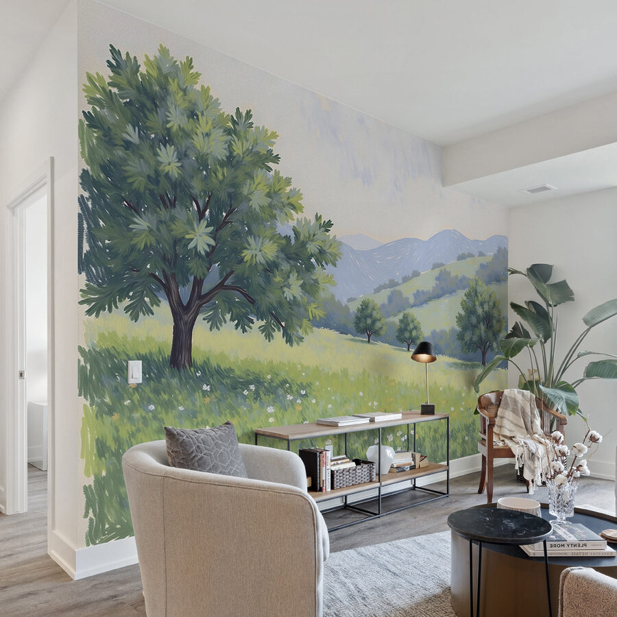 Transform a bland wall into a charming escape with this serene wall mural of trees and rolling hills. Imagine sipping your morning coffee while gazing at a dreamy landscape that feels like a gentle hug. The soft greens and blues invite calmness, making it perfect for cozy spaces. Picture someone stepping in, taking a deep breath, and feeling a wave of relaxation wash over them—it’s like a mini-vacation right at home. Whether it’s in the living room, bedroom, or even a home office, this mural adds a splash of nature that whispers, “Take it easy.” Perfect for nature lovers and those who crave a peaceful vibe.