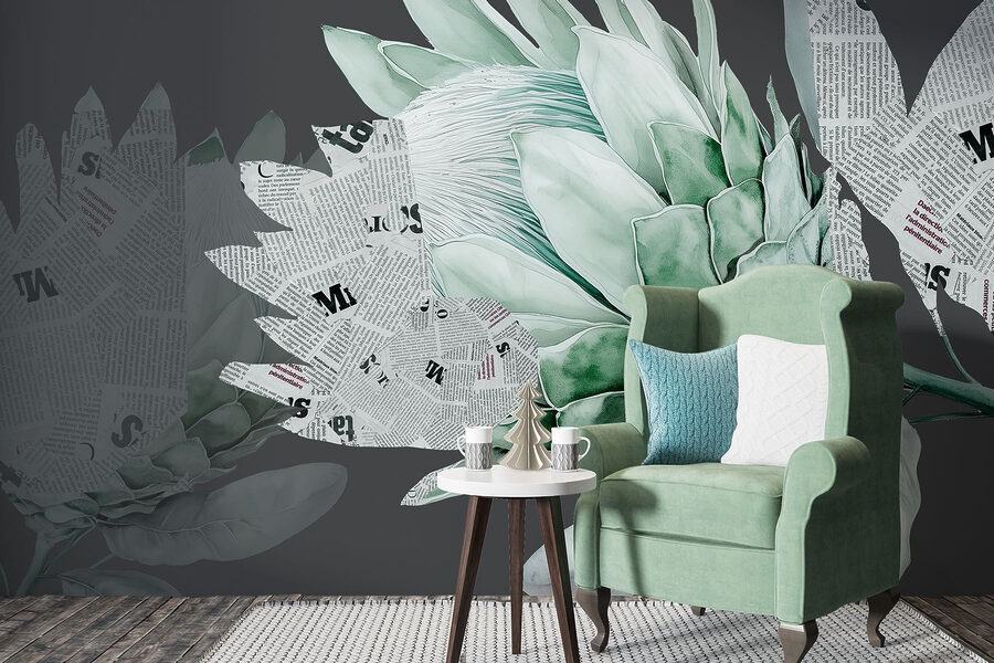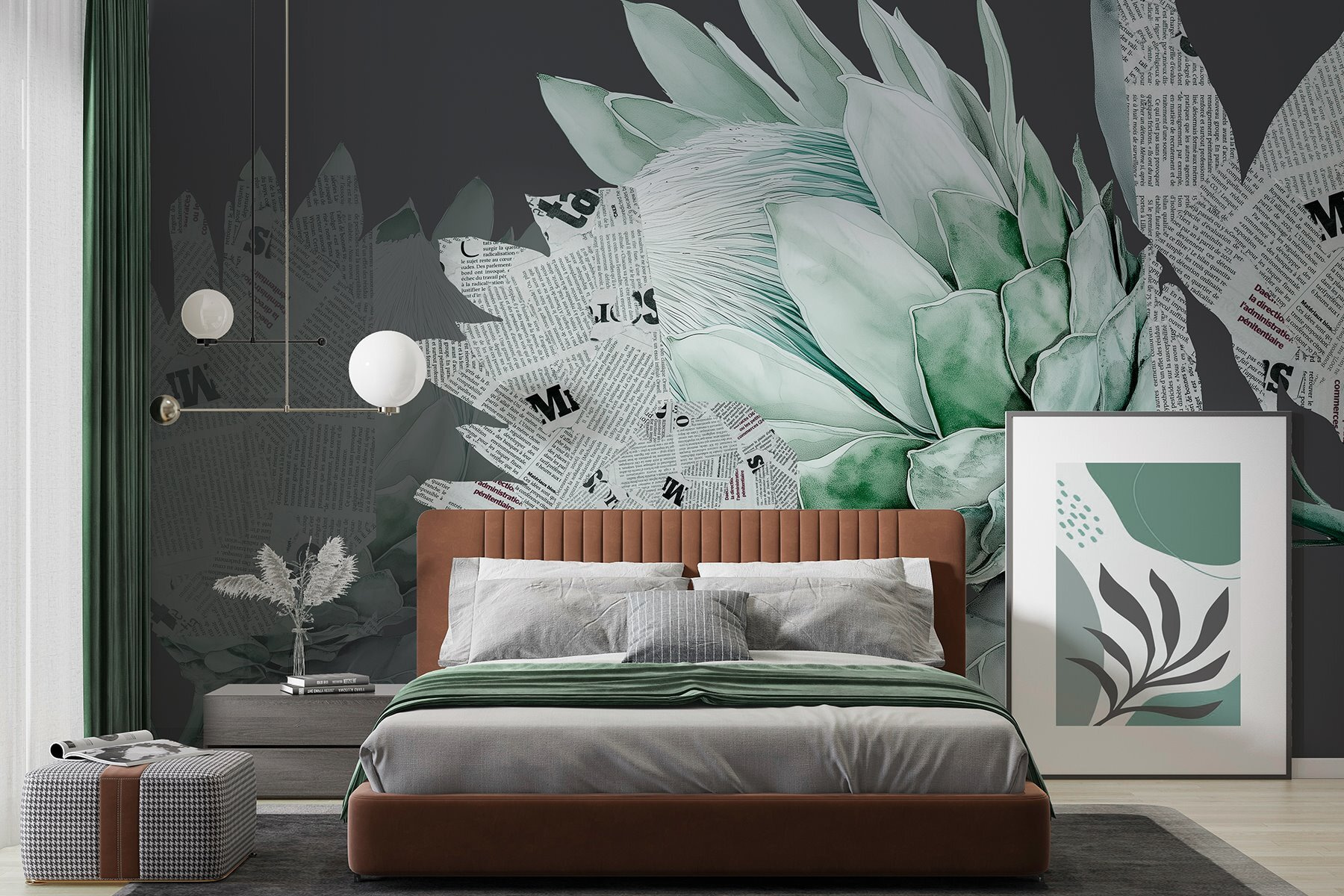Transforming a room can feel like magic, and this mural does just that. With its stunning artichoke design paired with playful newspaper clippings, it whispers stories of nature and urban life—like two long-lost friends finally meeting. Imagine walking into your space and feeling that delightful surprise every time. The cool greens pop against the dark background, making it a bold but cozy focal point. Perfect for a living room or even a quirky café, this mural adds character without saying a word. Just sit back, sip your coffee, and enjoy the vibe it brings. Who knew wall art could spark such joy?