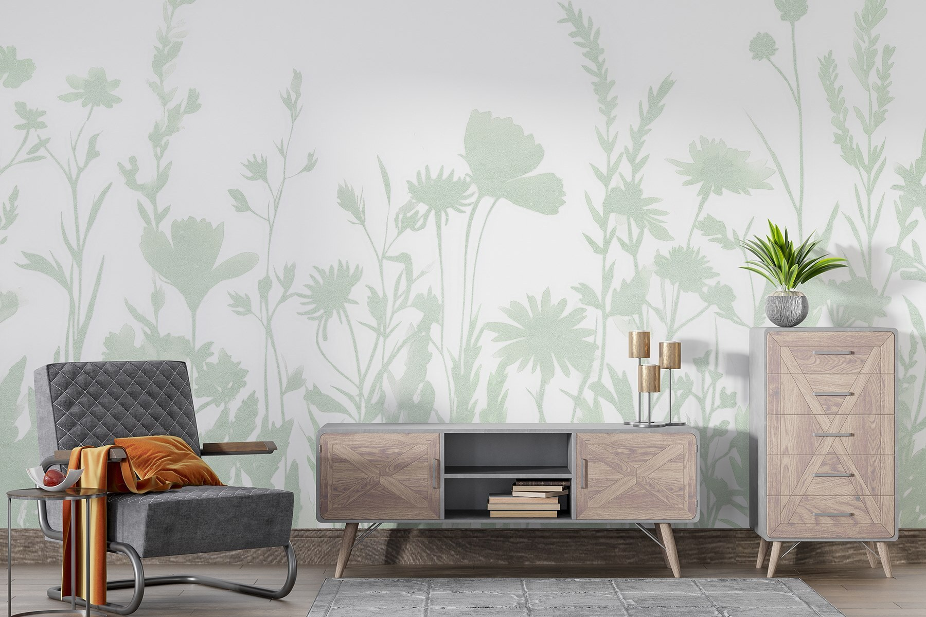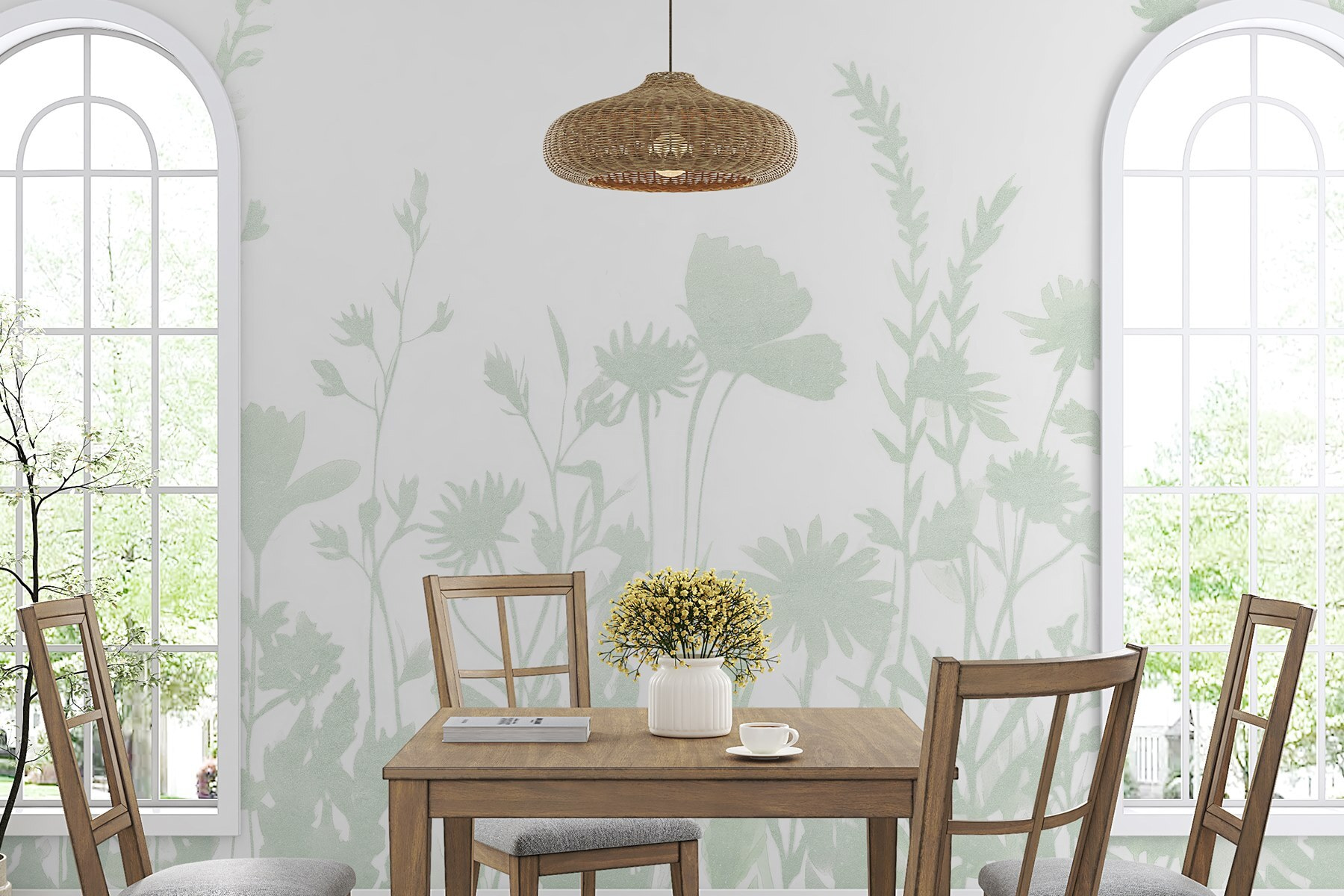 Transform any space with this lovely wall mural featuring delicate silhouettes of blooming flowers. It’s like a soft whisper of nature, bringing a hint of the outdoors right into your home. Imagine waking up to this serene scene—it’s the perfect backdrop for quiet mornings with a cup of tea or cozy evenings with a good book. The gentle greens evoke feelings of freshness and calm, making it ideal for any room, whether it’s a serene bedroom or a bright living space. It’s subtle, yet it makes a statement—just the right amount of charm to elevate your decor without overwhelming it. So, go ahead, let your walls bloom!