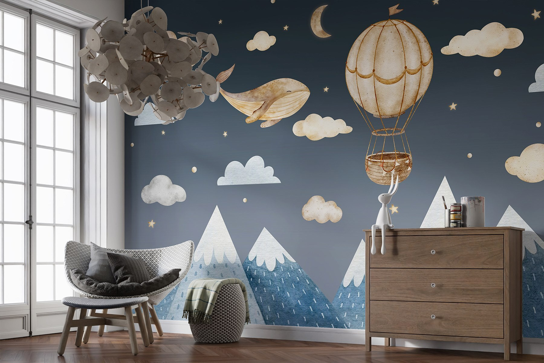 Imagine transforming a room into a dreamy escape with this whimsical wall mural featuring a charming whale and a hot air balloon drifting through a starlit sky. It’s like a storybook come to life! This mural brings a sense of adventure and wonder, perfect for a child’s room or any space needing a touch of magic. Picture a cozy evening, relaxing with a book while your little one drifts off, inspired by the gentle scenes around them. Everyone deserves a slice of imagination in their decor, and this mural adds just the right vibe. Plus, who wouldn’t want a whale flying by their walls? It’s sure to spark a giggle or two!