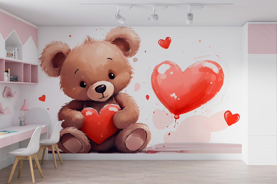 Transform any child’s room into a cozy wonderland with this adorable wall mural featuring a teddy bear holding a heart. It’s not just a mural; it’s like a warm hug on the wall! With playful hearts floating around, this piece brings a sprinkle of magic and joy, making it perfect for little dreamers. Imagine a sleepyhead waking up to this cuddly companion each day—talk about starting the morning on a happy note! It adds personality to the room while creating a peaceful atmosphere. Who wouldn’t smile at a bear that’s ready to share endless love? Perfect for inspiring sweet dreams and heartwarming adventures!
