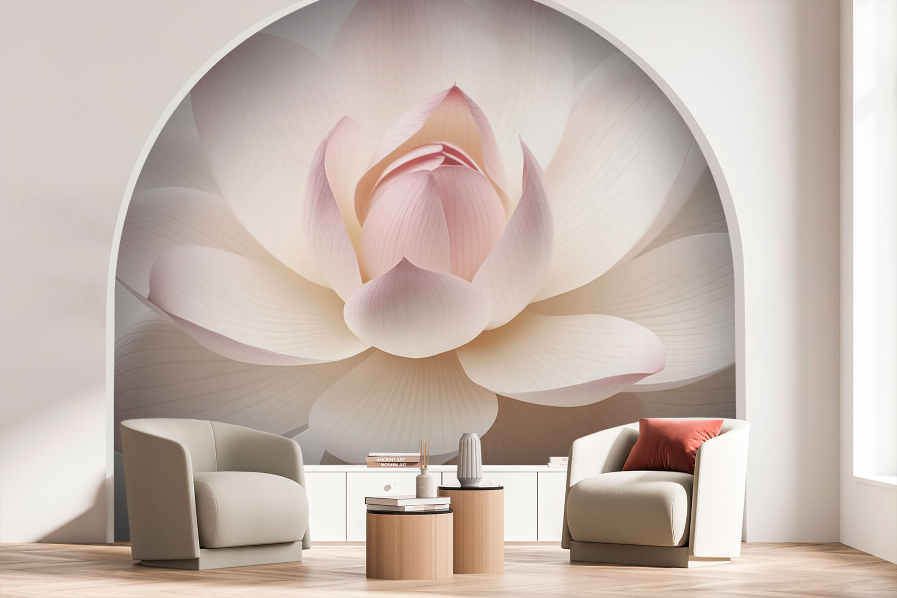 Transform your space into a serene sanctuary with this stunning wall mural, “Delicate Petals, Softly Unfolding Beauty.” Picture stepping into a calm, floral embrace every time you walk into the room. The creamy petals, softly tinged with blush, invite a sense of warmth and tranquility that’s hard to resist.