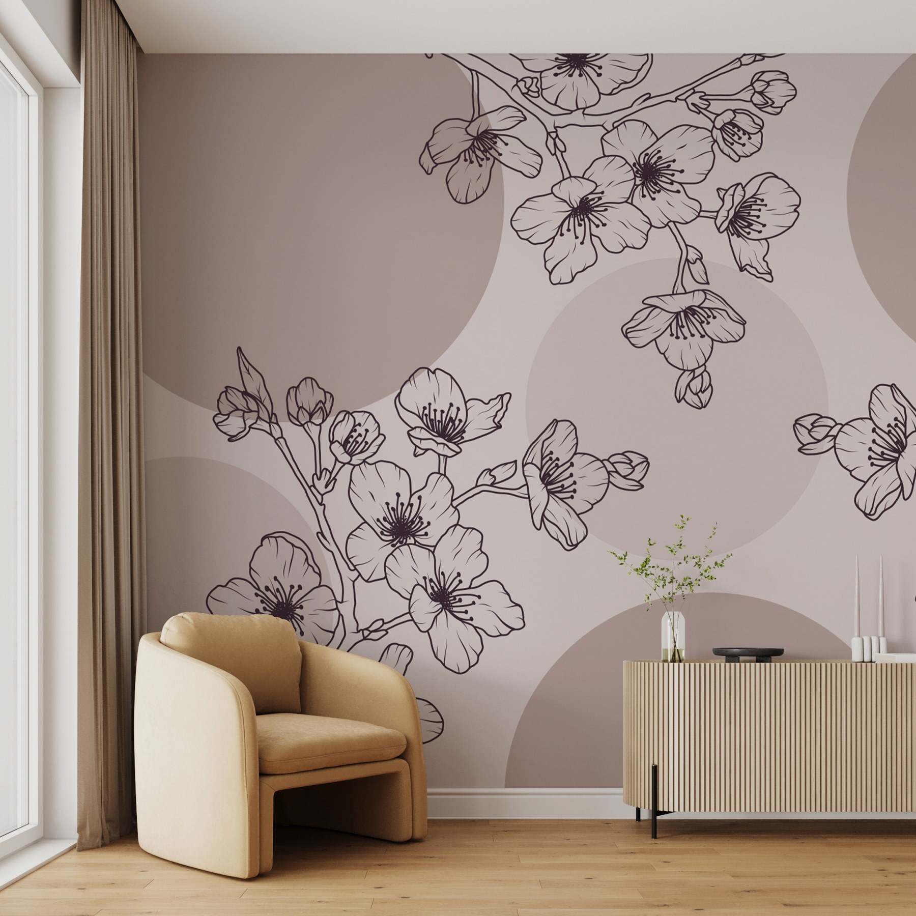 Transform your space with this enchanting mural, “Delicate Blooms in Soft Tones.” Imagine stepping into a serene Japanese garden, where every corner is a soft whisper of nature’s beauty. The gentle lines of blossoms dance gracefully against warm circles, bringing a soothing touch that’s like a warm hug for your walls. It’s perfect for creating a calming atmosphere in a cozy reading nook or brightening up a dinner party space. Who wouldn’t want to feel like they’re sipping tea surrounded by blossoms? This mural is a little escape, right in your home, inviting joy and tranquility every day.