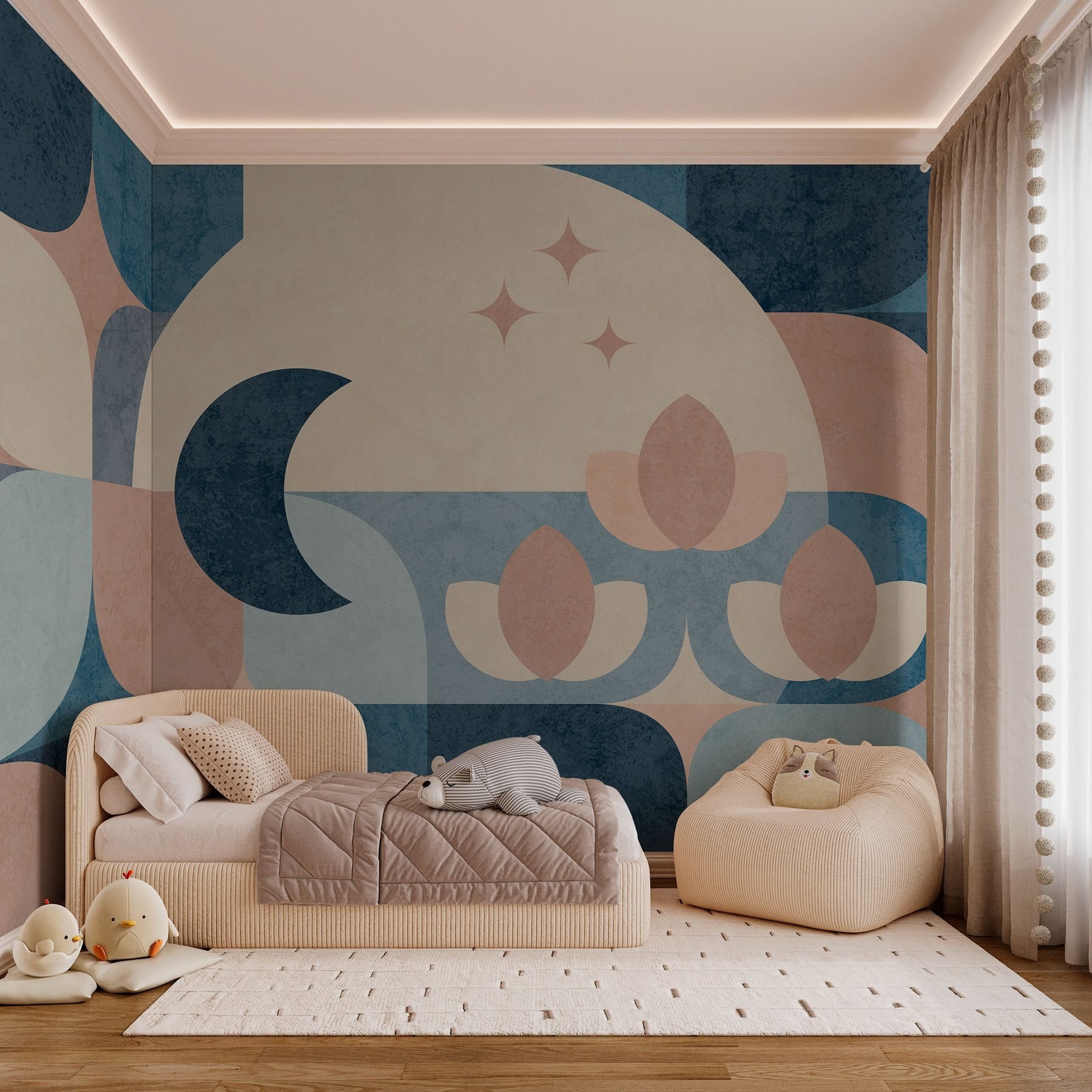 Add a splash of creativity to any room with this blue and pink geometric mural! Imagine walking into a space that radiates calm and warmth, as if the artwork is gently whispering stories of sunshine and moonlight. The playful shapes dance together, creating a harmonious vibe that feels both modern and inviting. It’s perfect for that wall that just feels too bare or for giving a cozy nook a fresh twist. Friends might just find themselves lingering, admiring how the colors seem to shift with the light. Whether it’s a serene bedroom or a lively living area, this mural beckons comfort and conversation. Who wouldn’t want a chat with such a charming backdrop?