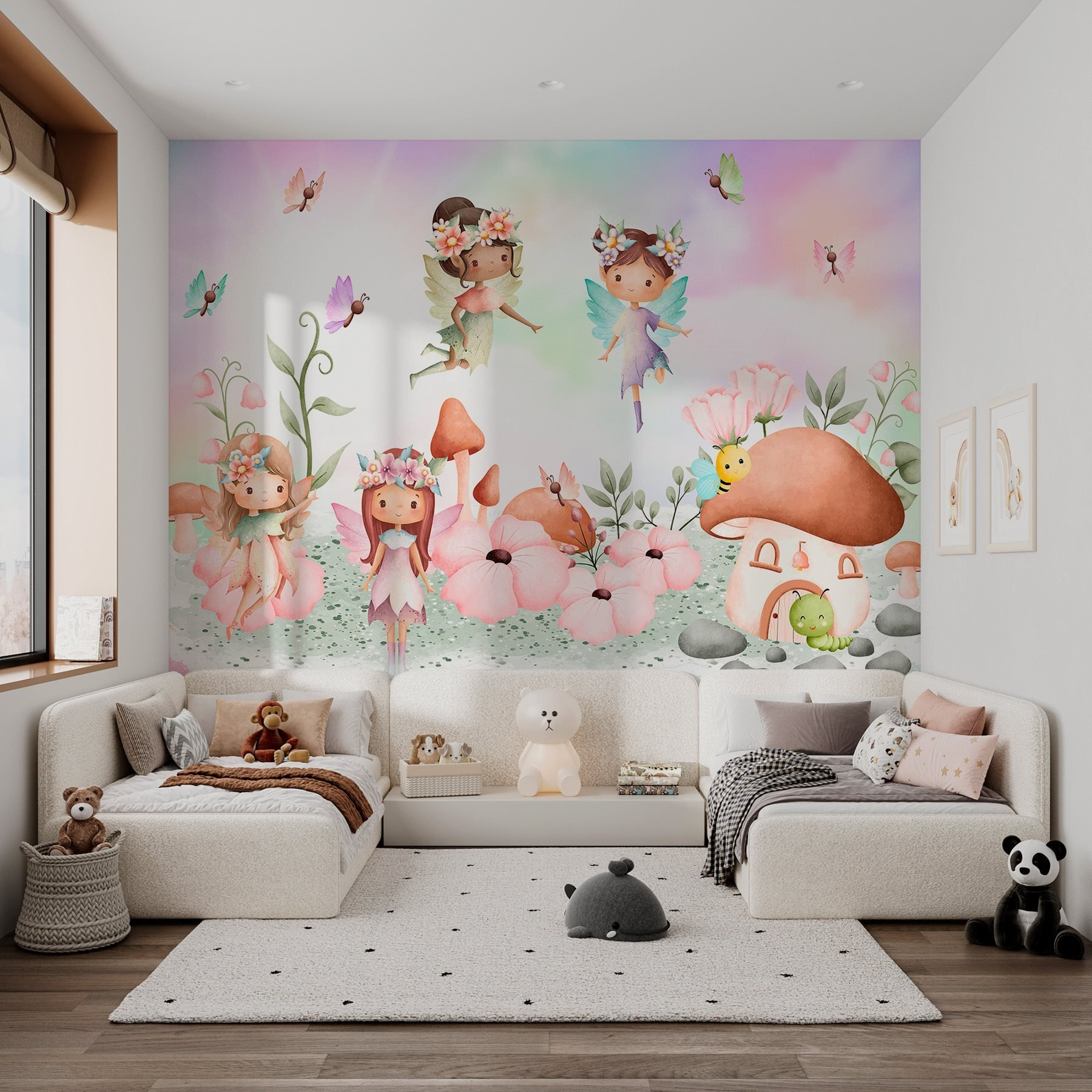 Transform any space into a magical escape with this enchanting mural featuring fairies frolicking in a garden. Imagine little ones getting lost in their daydreams, exploring alongside these charming creatures amidst blooming flowers and adorable mushrooms. It’s like inviting a sprinkle of whimsy right onto your walls! Bright colors and playful details make it a delight for any child’s room, creating a cozy nook that feels both adventurous and soothing. Who wouldn’t want a fairy party right there at home? It’s bound to spark giggles and tales of adventure!