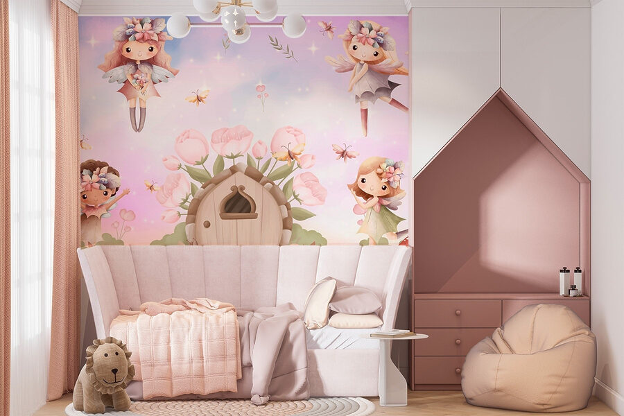 Dive into a whimsical world with this delightful mural featuring a fluttering group of fairies soaring through a pastel sky. Each fairy sparkles with charm, surrounded by blooming flowers and playful butterflies, inviting smiles and daydreams. Picture this in a child’s room, transforming the space into a magical retreat where imagination runs wild. The cheerful colors and enchanting scenes make it hard not to feel a bit lighter and brighter. Snails peeking out, tiny mushrooms sprinkled about—it’s a wonderland of creativity that just might inspire a few fairy tales of their own! Perfect for sparking joy and adventure.