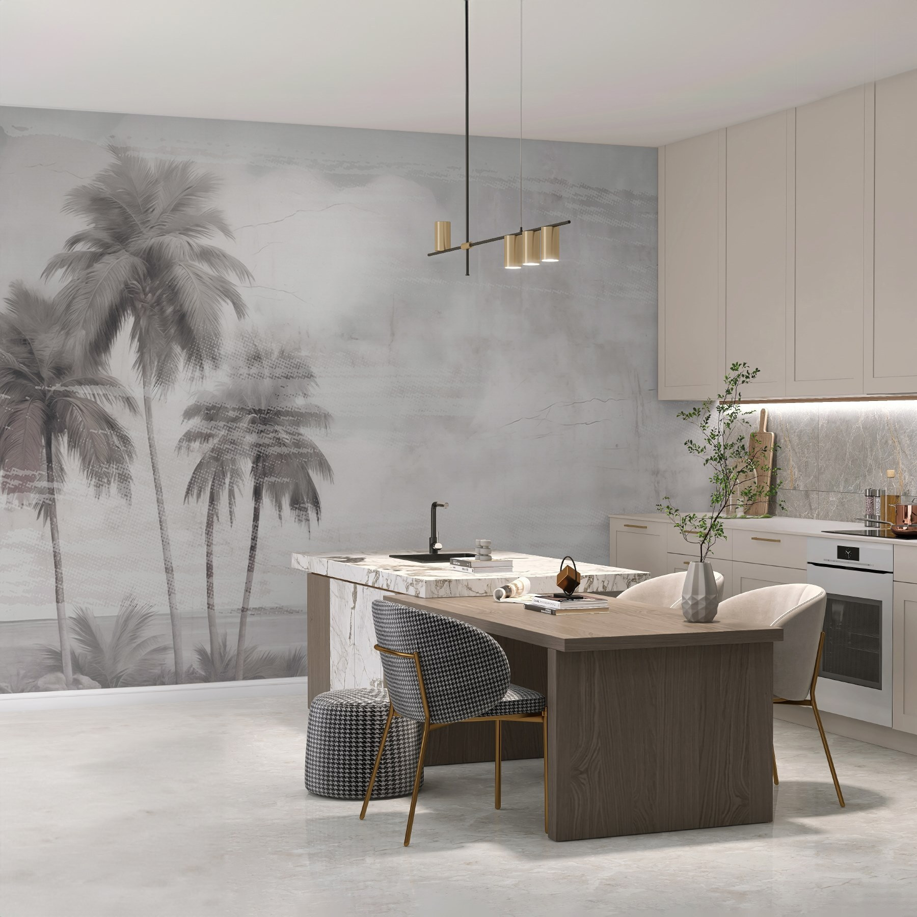 Transform your space into a tropical oasis with this mural of palm trees. Imagine sipping a cool drink, feeling the gentle breeze right there in your living room. The soft tones invite a sense of calm, making it perfect for a cozy reading nook or a lively gathering spot. Each palm stands tall, whispering secrets of sandy beaches and sunlit skies. It’s like bringing a piece of paradise home—no sunscreen needed. Whether you’re dreaming of summer or just want a touch of nature indoors, this mural has you covered—without the mosquito bites!