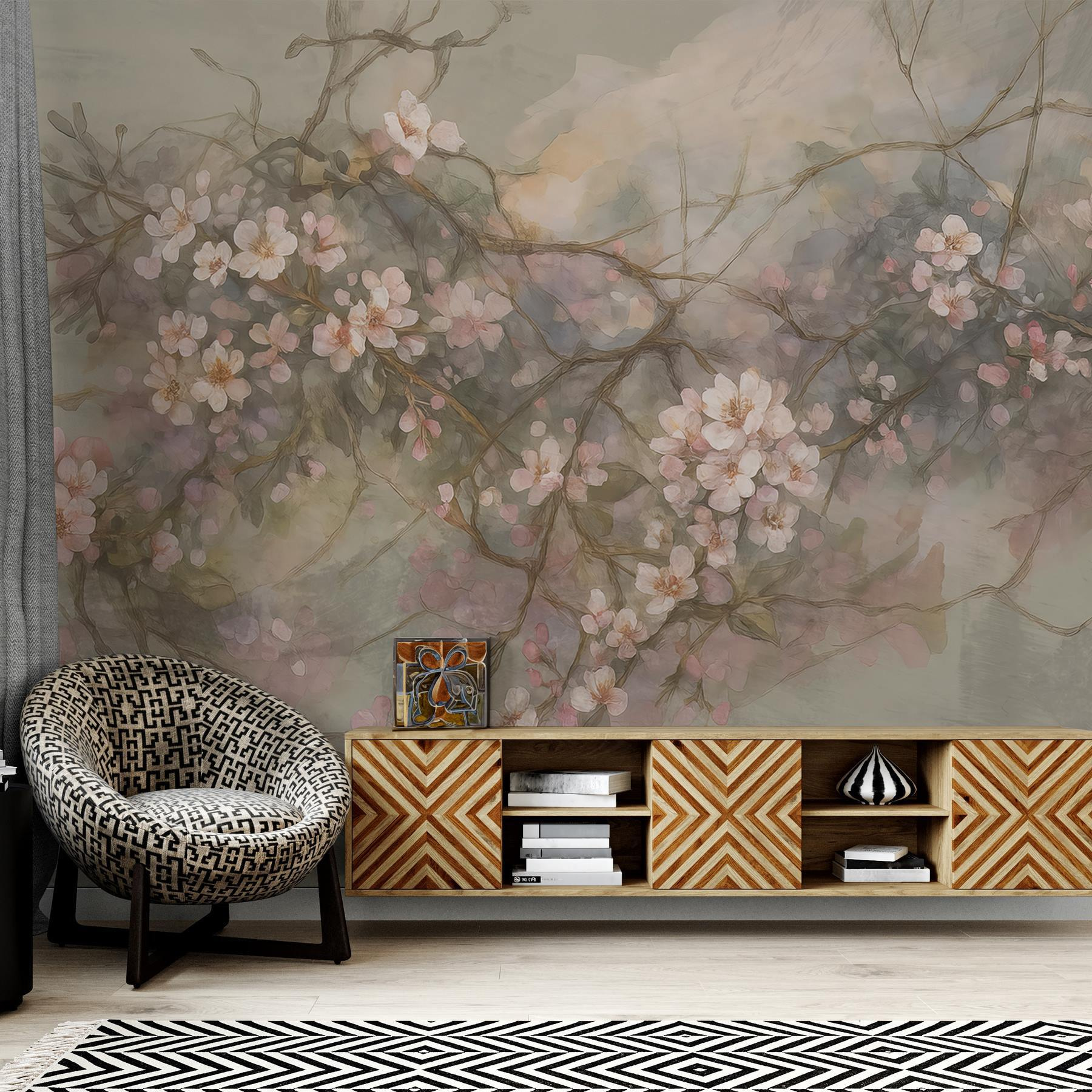 Transform a plain wall into a serene escape with this exquisite mural featuring delicate flowers on branches. Imagine walking by and catching a glimpse of those soft petals—it’s like having a tranquil Japanese garden right in your home. Brightening up any space, this watercolor design brings a dreamy, calm vibe. Perfect for cozy corners or expansive living areas, it invites daydreams and gentle memories. Feel the change as light dances on its hues, warming up the atmosphere. Just picture yourself sipping tea, wrapped in nature’s embrace, while the petals twirl softly in your imagination.