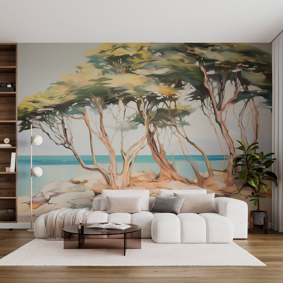 Transform your space into a serene escape with this enchanting wall mural of trees on a rocky island. Picture those gentle, rustling leaves whispering secrets while you sip your morning coffee. The soft watercolor hues invite a sense of calm, perfect for a cozy reading nook or a lively living room filled with laughter. Imagine friends gathering round, admiring this piece that brings a slice of nature indoors. It’s like a little holiday for your walls, providing a gentle reminder of faraway shores and peaceful islands. Who wouldn’t want that?