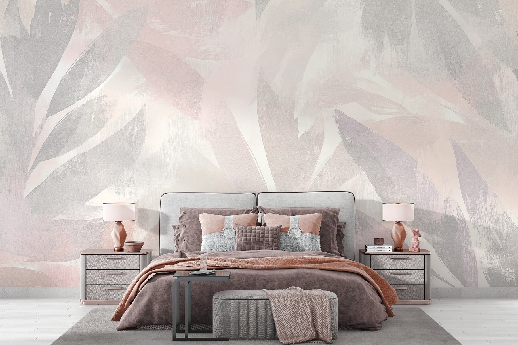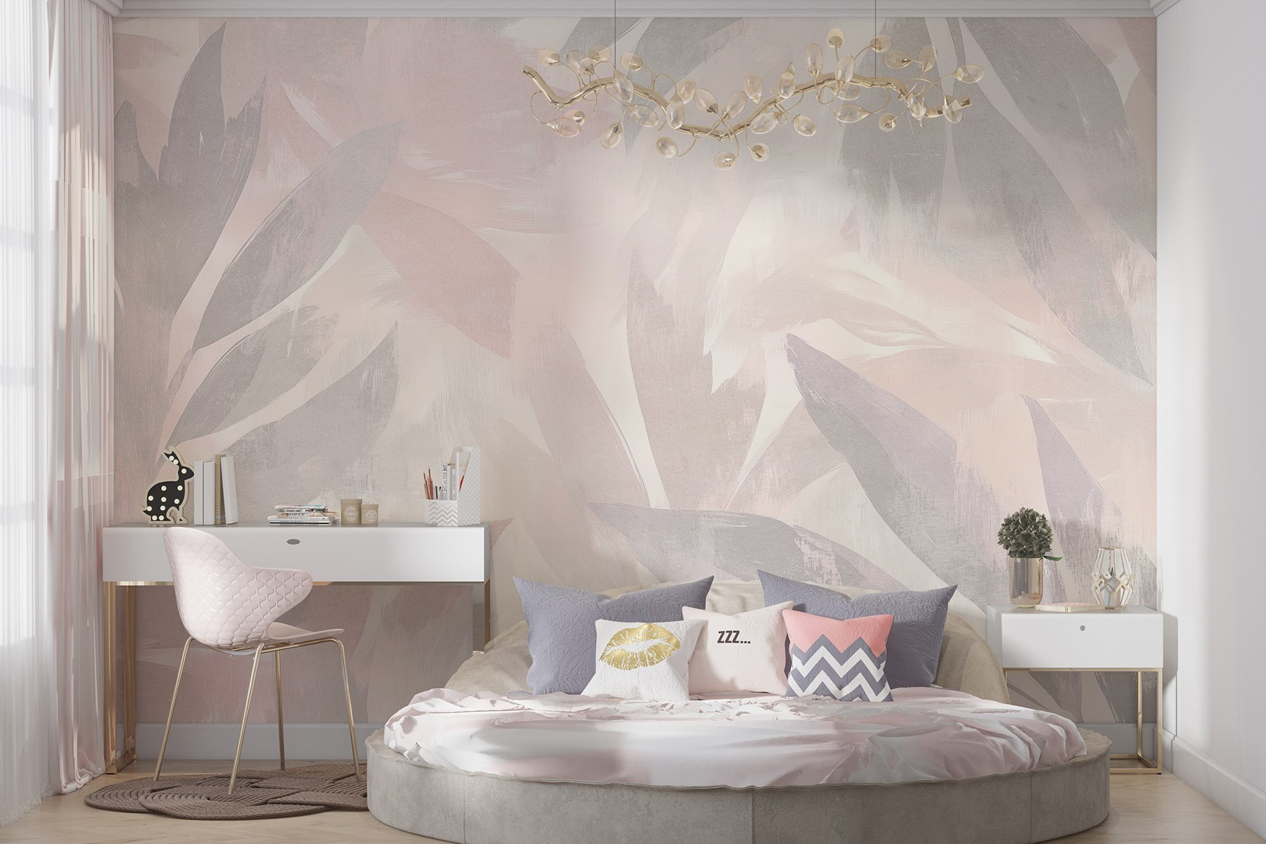 Transform any room into a serene escape with this mural featuring a soft blend of white and pink, paired with gentle foliage patterns. Imagine walking into your space and feeling that instant calm wash over you, like a gentle hug from nature. Perfect for those cozy corners or even larger walls, this design invites a subtle elegance. It’s like bringing the outdoors in, minus the pesky bugs. Picture it over a comfy reading nook or behind a stylish sofa—your guests will definitely stop and admire. A touch of grace in every leaf!