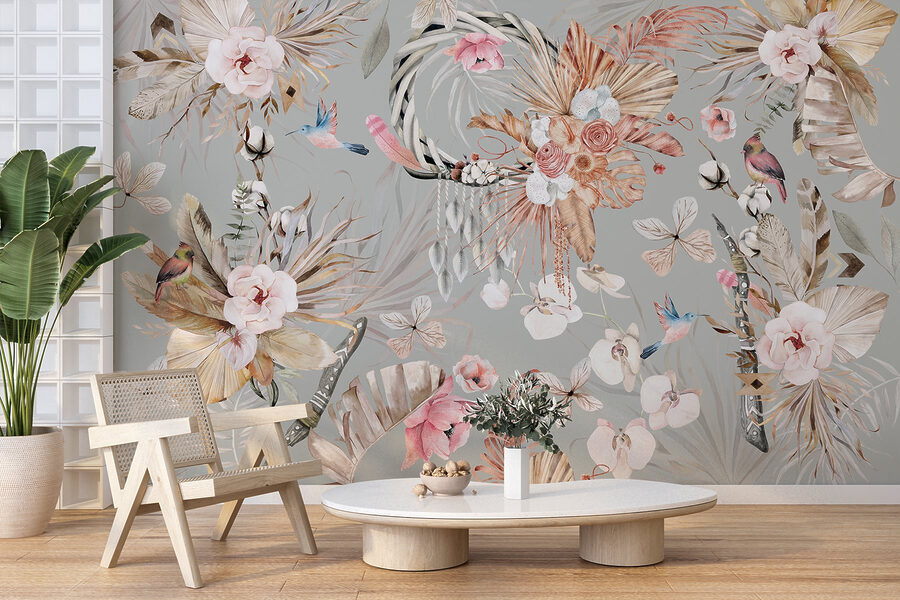 Transforming a room can be as easy as adding this stunning wall mural featuring flowers and feathers. It’s like bringing a piece of nature indoors—without the pesky bugs. Imagine waking up each day to a vibrant blend of soft blooms and graceful feathers, gently reminding you of a peaceful garden stroll. Each glance at the mural might spark a cozy daydream or invite a warm chat with a friend about the beauty of the outdoors. Sure, it’s just a wall, but why not turn it into a little burst of joy? This mural could easily become the backdrop for those laughter-filled moments over a cup of coffee or a quiet evening lost in a good book.