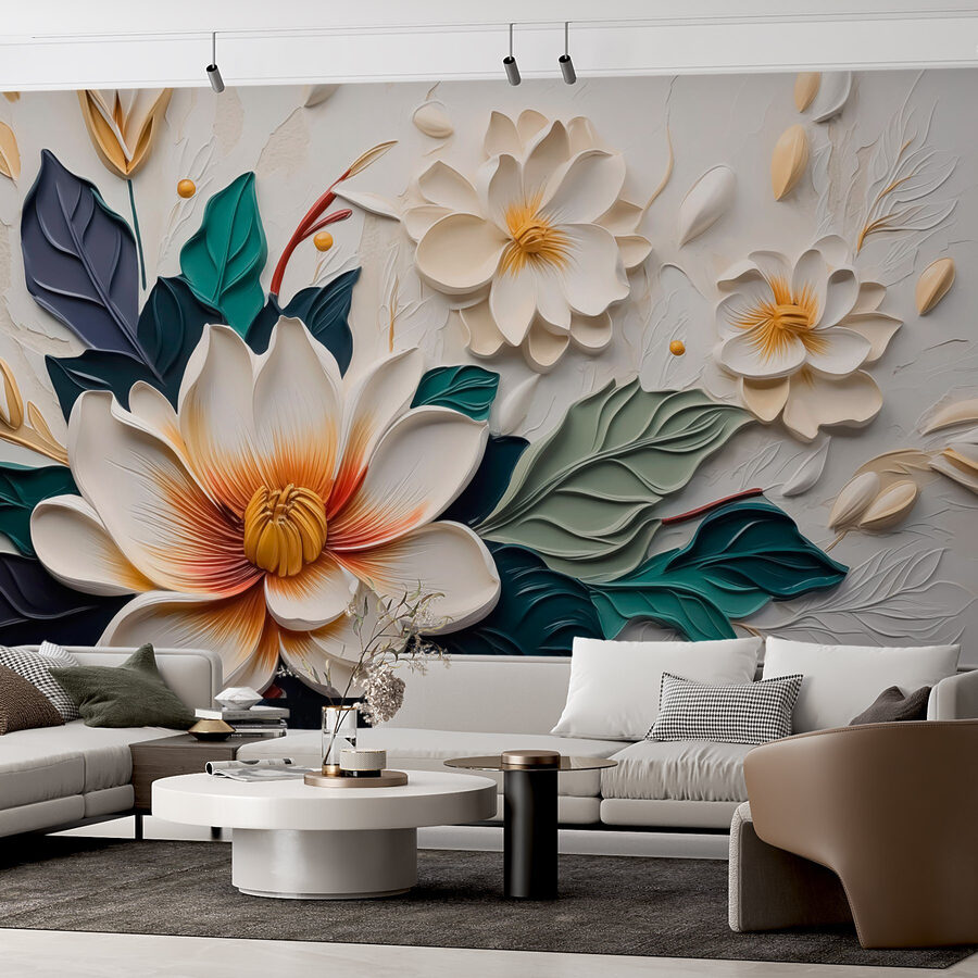 Brighten up any room with this stunning wall mural featuring white and yellow flowers dancing among lush leaves. It’s like bringing a garden indoors, minus the watering can and pesky bugs. Imagine sipping your morning coffee, surrounded by these cheerful blooms, instantly boosting your mood. The subtle color palette ties everything together, creating a serene vibe. Perfect for a cozy living room or a calming bedroom retreat, this mural can make a space feel inviting and warm. Plus, it’s a great conversation starter—everyone loves a good chat about flowers, right? Just think how much joy it’ll spread!