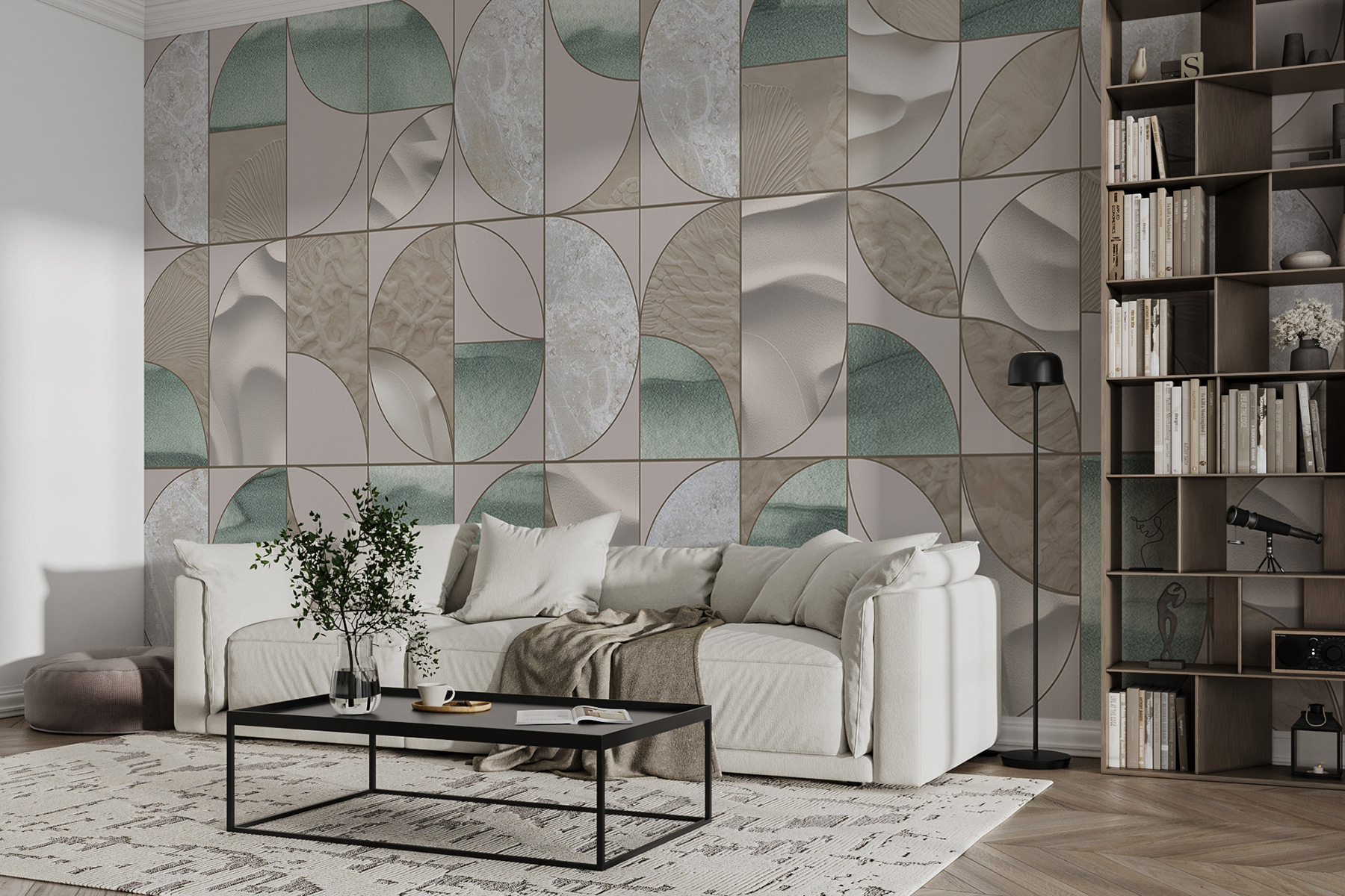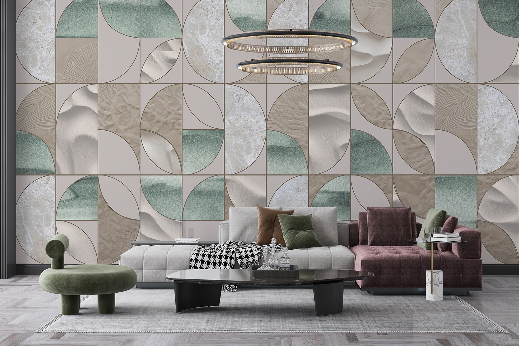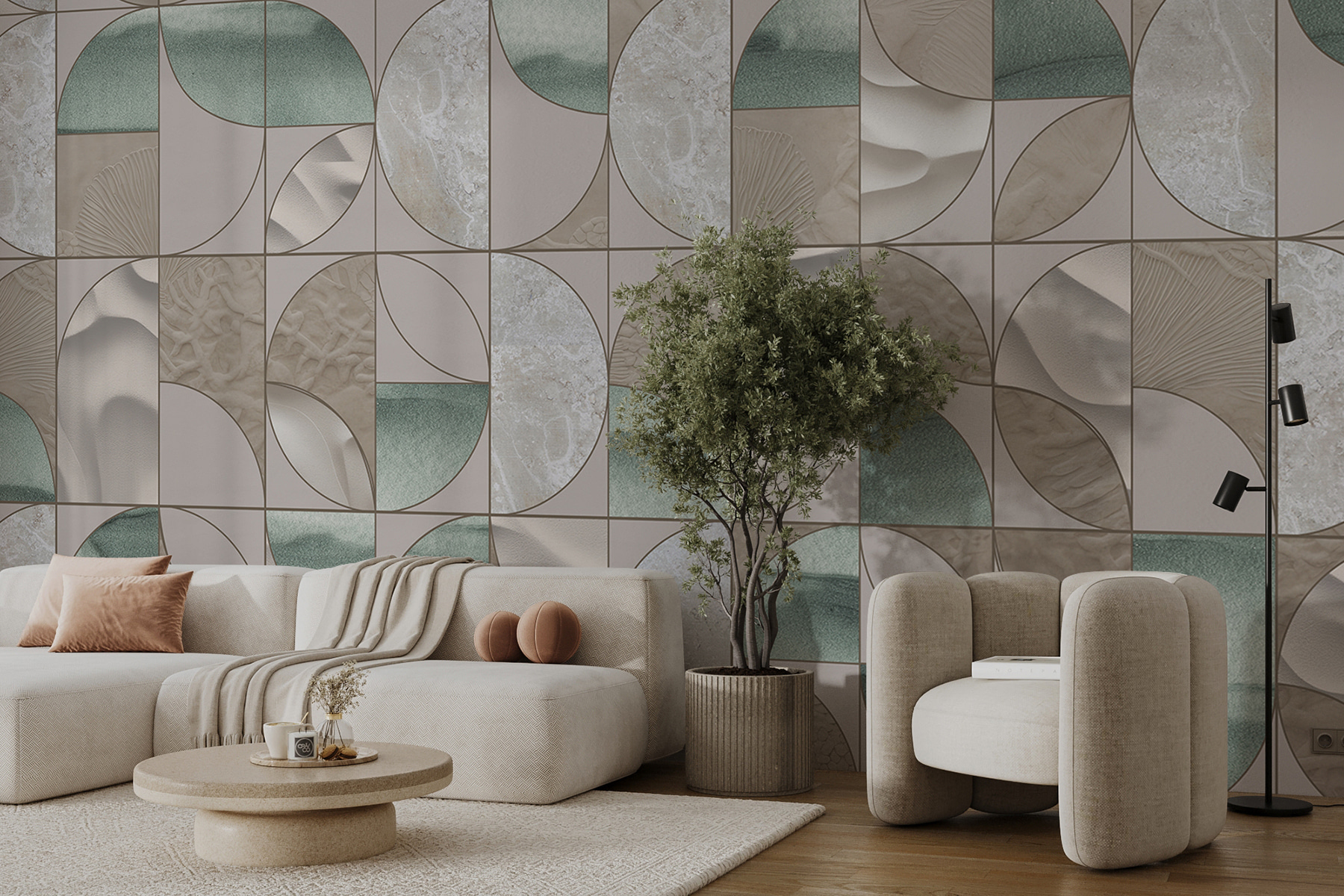 Brighten up walls with this stunning mural featuring a playful pattern of circles and soft shapes. It’s like a geometric dance party for your room, where subtle tones mingle and create a cozy atmosphere. Imagine entering a space that feels both calming and a little bit cheerful—a perfect backdrop for lazy Sunday brunches or cozy movie nights. Each section tells its own story, inviting you to explore and get lost in the details. Perfect for those who love modern design, it adds a touch of flair without screaming for attention. Let your walls do the talking!
