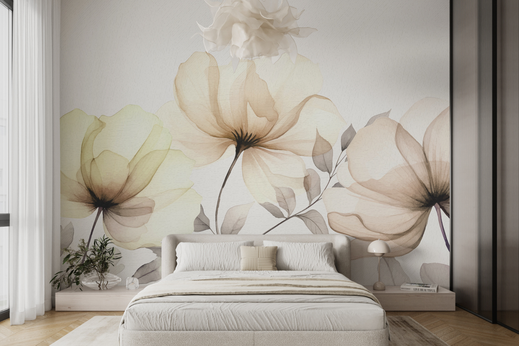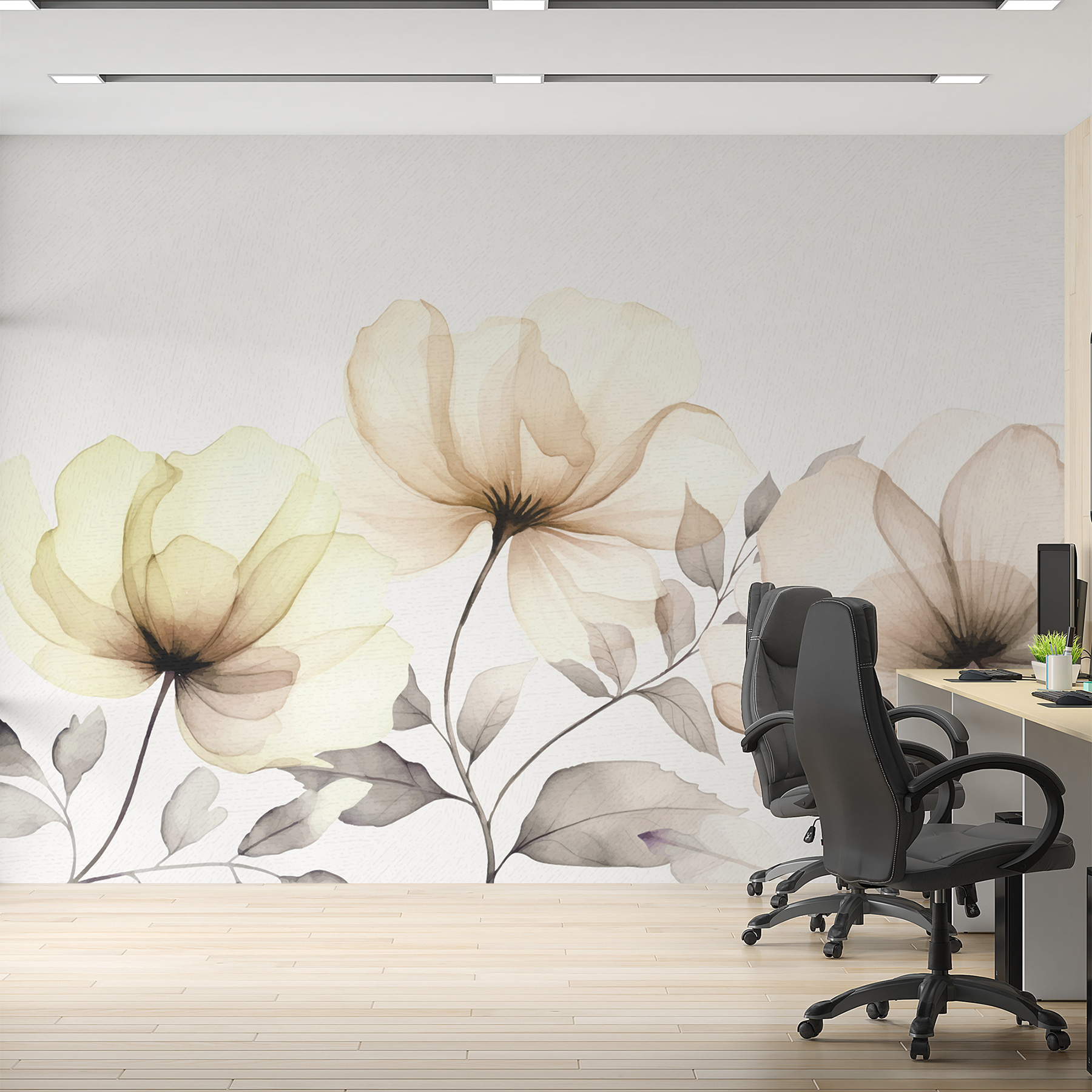 Transforming a space can be as simple as adding the Wall Mural “Delicate Flowers Dancing in Light.” Picture this: you walk into a room and boom—there’s a burst of soft blooms, elegantly stretching and swaying, like they’re caught in a gentle breeze. Those subtle tones of cream and soft green? They set a serene vibe, making even the busiest day feel a bit calmer. Whether it’s in a cozy reading nook or a bright hallway, it invites conversations and daydreams, turning any wall into a masterpiece. It’s like having a garden that never wilts—always lovely, always refreshing. Who wouldn’t feel lighter just looking at it?