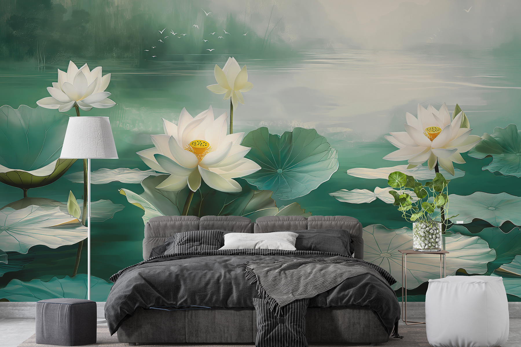 Transform any space with this stunning mural painting of white flowers and leaves gliding serenely across a tranquil lake. It brings a touch of nature’s elegance right into your home, offering a moment of peace whenever you glance its way. Picture hosting friends who can’t help but marvel at its beauty or curling up with a good book, feeling as if you’re lounging by a peaceful pond. The soft greens and whites create a calming atmosphere—perfect for daydreaming or letting your thoughts wander. Who wouldn’t want a slice of this serene getaway at home?