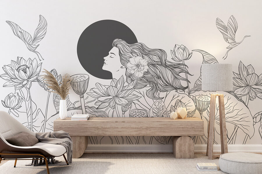 Transform your space with this stunning mural that captures a serene moment—an enchanting woman with long, flowing hair, surrounded by lively flowers and graceful birds. It’s like bringing a piece of nature indoors, minus the pollen! Imagine waking up to this beauty every day; it’d set the mood, right? Perfect for a cozy nook or as a statement piece in your living room, it invites warmth and inspiration. Plus, who wouldn’t want a mural that whispers tales of beauty and tranquility? This isn’t just decor—it’s a daily reminder to pause and breathe.
