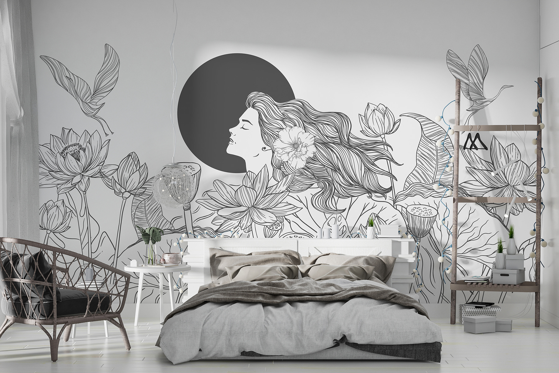 Transform your space with this stunning mural that captures a serene moment—an enchanting woman with long, flowing hair, surrounded by lively flowers and graceful birds. It’s like bringing a piece of nature indoors, minus the pollen! Imagine waking up to this beauty every day; it’d set the mood, right? Perfect for a cozy nook or as a statement piece in your living room, it invites warmth and inspiration. Plus, who wouldn’t want a mural that whispers tales of beauty and tranquility? This isn’t just decor—it’s a daily reminder to pause and breathe.
