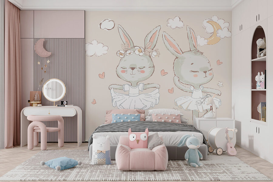 Transform any wall into a whimsical wonderland with the “Couple of Bunnies in Ballet Tutu” mural. Picture this: two adorable bunnies dancing under the stars, hearts fluttering around like confetti. Who knew bunnies could be so graceful? The soft colors bring a gentle vibe, perfect for bringing warmth to a child’s room or adding charm to a cozy nook. Imagine walking into a room and instantly feeling like you’ve stepped into a delightful storybook. Guests won’t just see the mural; they’ll melt at the cuteness overload! It’s a playful touch that brings joy—because really, who can resist ballet bunnies?