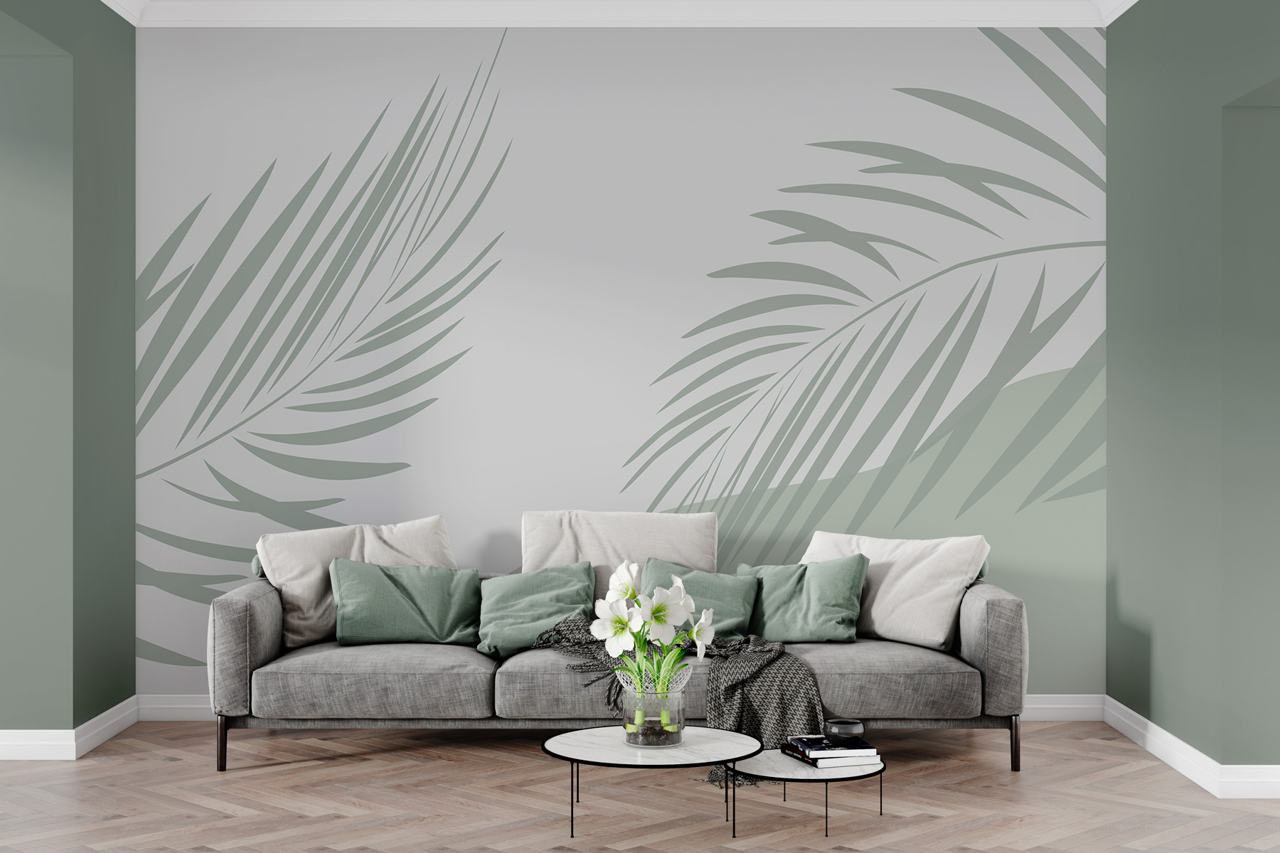 Transform any room into a serene getaway with this “Wall Murals Palm Leaves on a Grey Background.” It’s like bringing a piece of nature right into your living space—without the messy potting soil, of course! The gentle greens dance against the soft grey, creating a soothing vibe perfect for relaxing or catching up with friends. Imagine lounging with a good book, surrounded by this calming backdrop. It’s understated yet impressively stylish; it whispers elegance. Plus, the palms add a hint of tropical flair that might just make you dream of island escapes. Perfect for any decor style, this mural makes a place feel alive. So, why not treat your walls to a little Vitamin D?