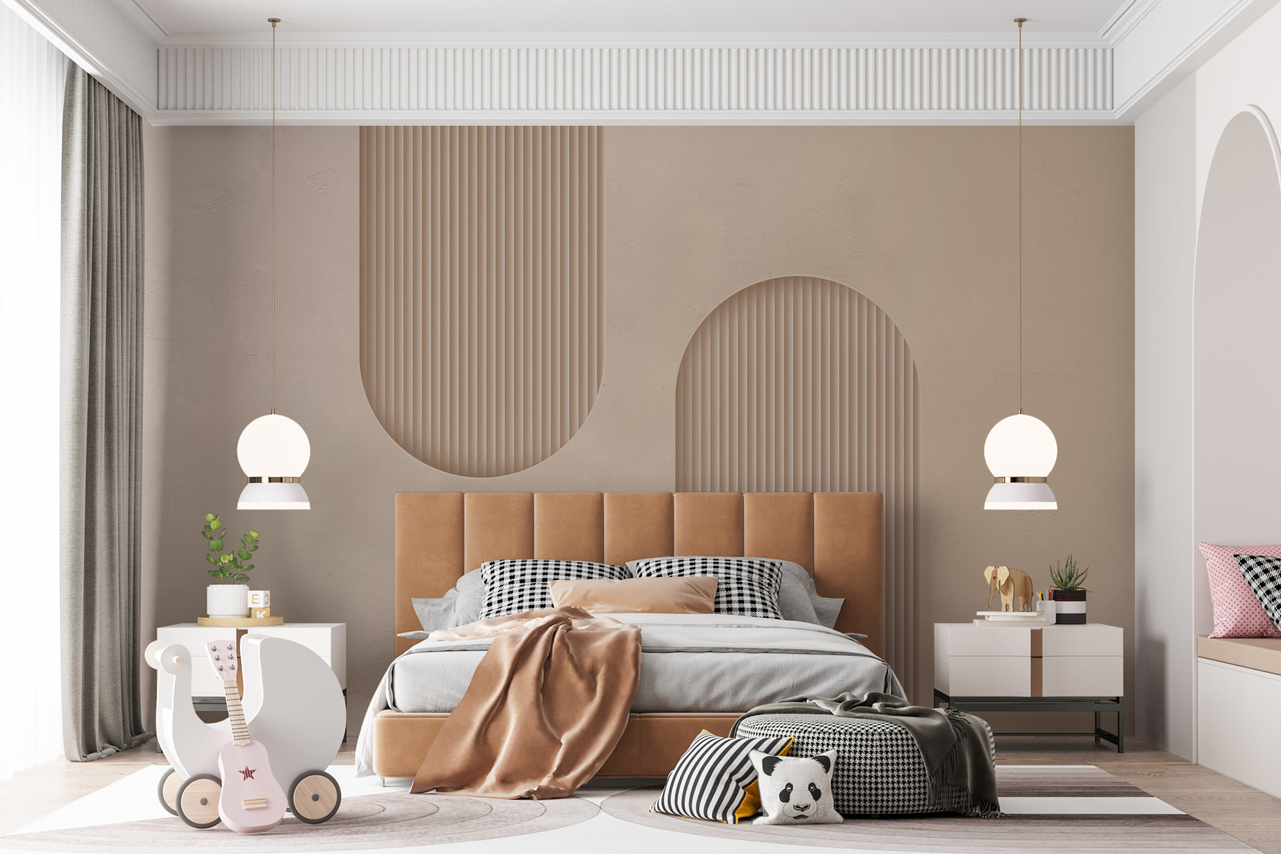 Imagine walking into a room adorned with “Cream Arches with Rhythmic Lines.” Instantly, the soft beige tones wrap around you like a warm hug, making even the dullest day feel a little cozier. The playful arches dance across the wall, creating a rhythm that soothes the eye and sparks the imagination. It’s like a gentle reminder that life can be both structured and free-spirited. Picture a lazy afternoon spent here, maybe with a good book or a cup of tea, and feeling a sense of calm wash over. Perfect for a bedroom or a creative nook, this mural’s subtle charm would make anyone smile—maybe even inspire a little daydreaming!
