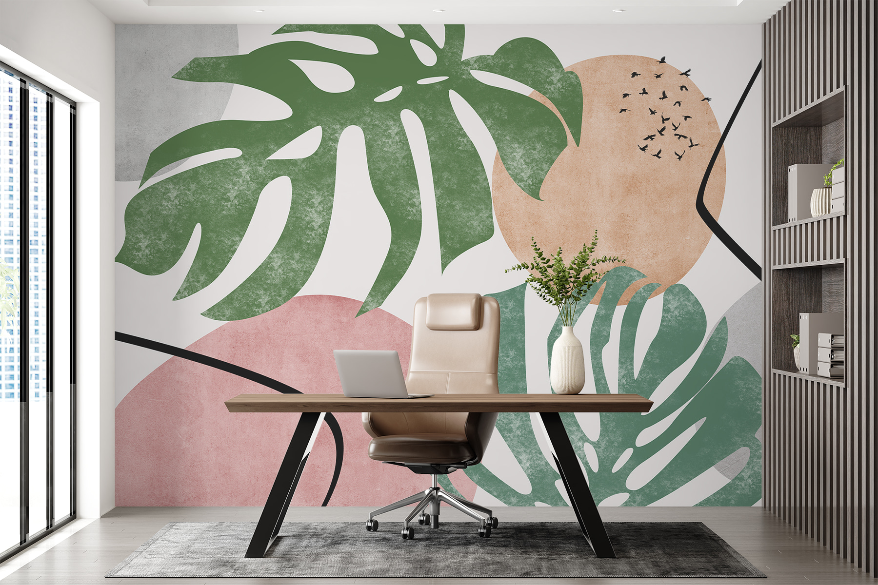 Transform any wall into a mini tropical getaway with the “Tropical Minimalism: Birds and Leaves” mural. Imagine stepping into a sun-kissed paradise right at home. The soothing greens and soft pastels invite a sense of calm, while playful birds add a touch of whimsy. It’s like having a little piece of nature wrapped around your living space. Perfect for that one wall that just needs some love, this mural will make you want to toss on a beach hat and sip a fruity drink in your living room. Who knew home decor could feel this refreshing?