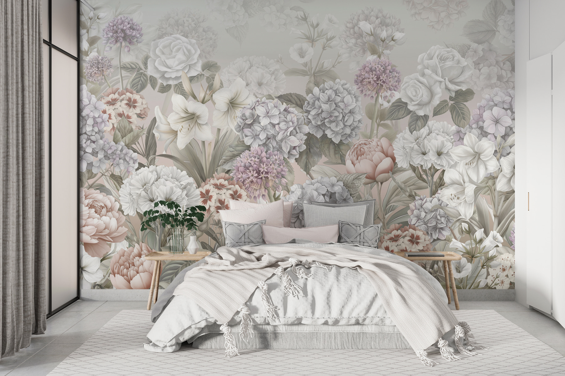 Transform your space with the “Elegant Floral Symphony in Bloom” mural. Picture stepping into a dreamy garden every day—peonies, hydrangeas, and roses dance together in soft pastels. This mural whispers elegance while also adding a playful touch, like flowers swaying in a gentle breeze. Imagine hosting friends, and the conversation drifts to how this beauty draws everyone in. Plus, it’s perfect for setting a relaxed vibe in any room, making you feel just a bit fancier. Who knew wall art could be this inviting? It’s like a hug from nature!