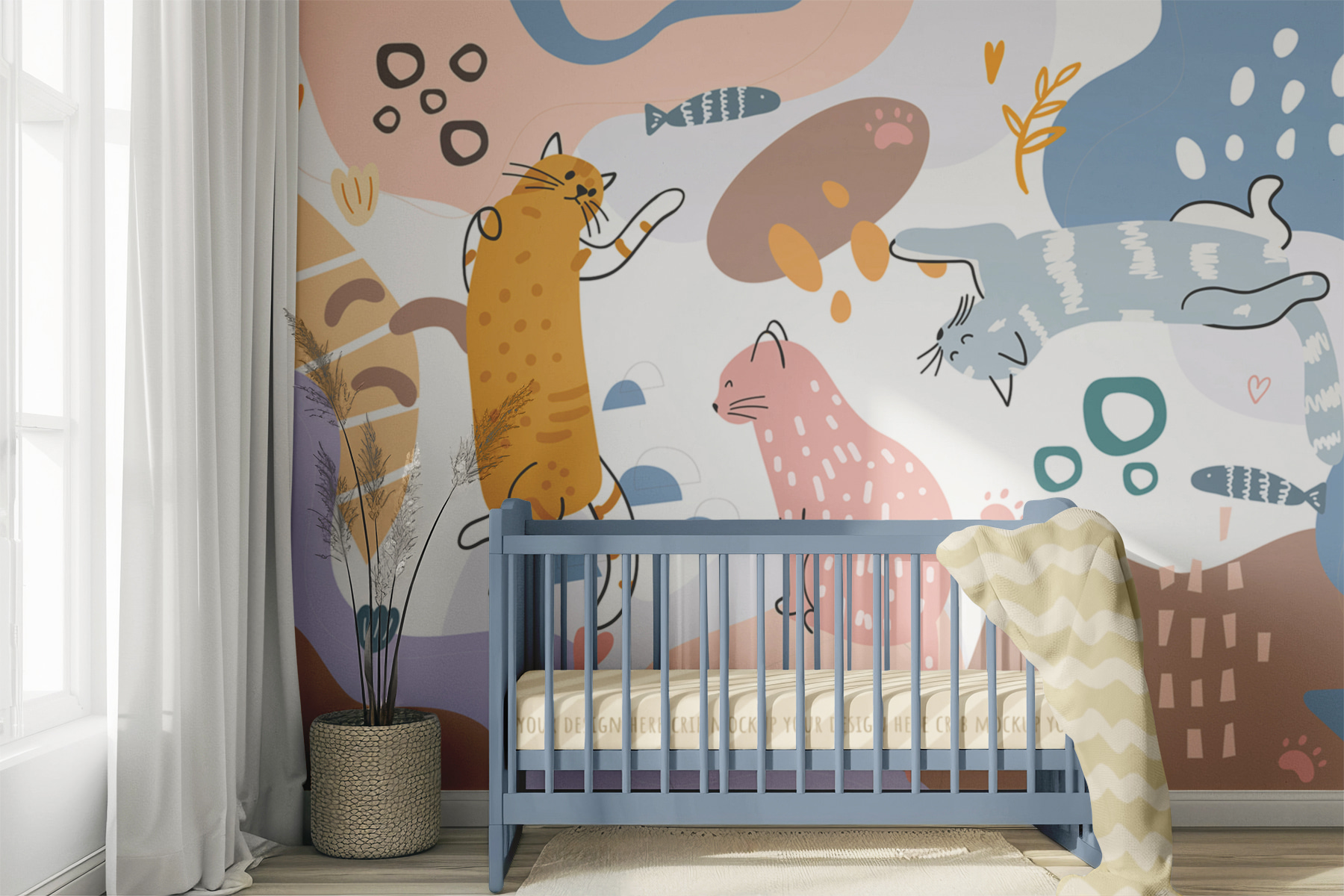 Transform your space with this delightfully quirky mural featuring a vibrant trio of cats at play. Imagine walking into a room where these lively, colorful felines instantly draw attention, making everyone smile. The playful design is more than just decor—it’s a daily reminder of joy and imagination. Picture this mural on a feature wall, sparking conversations among guests and possibly envy from dog lovers. It brings a splash of warmth and creativity, turning an ordinary area into an inviting, fun-filled escape. Perfect for a cat lover’s sanctuary or a cheerful entryway!