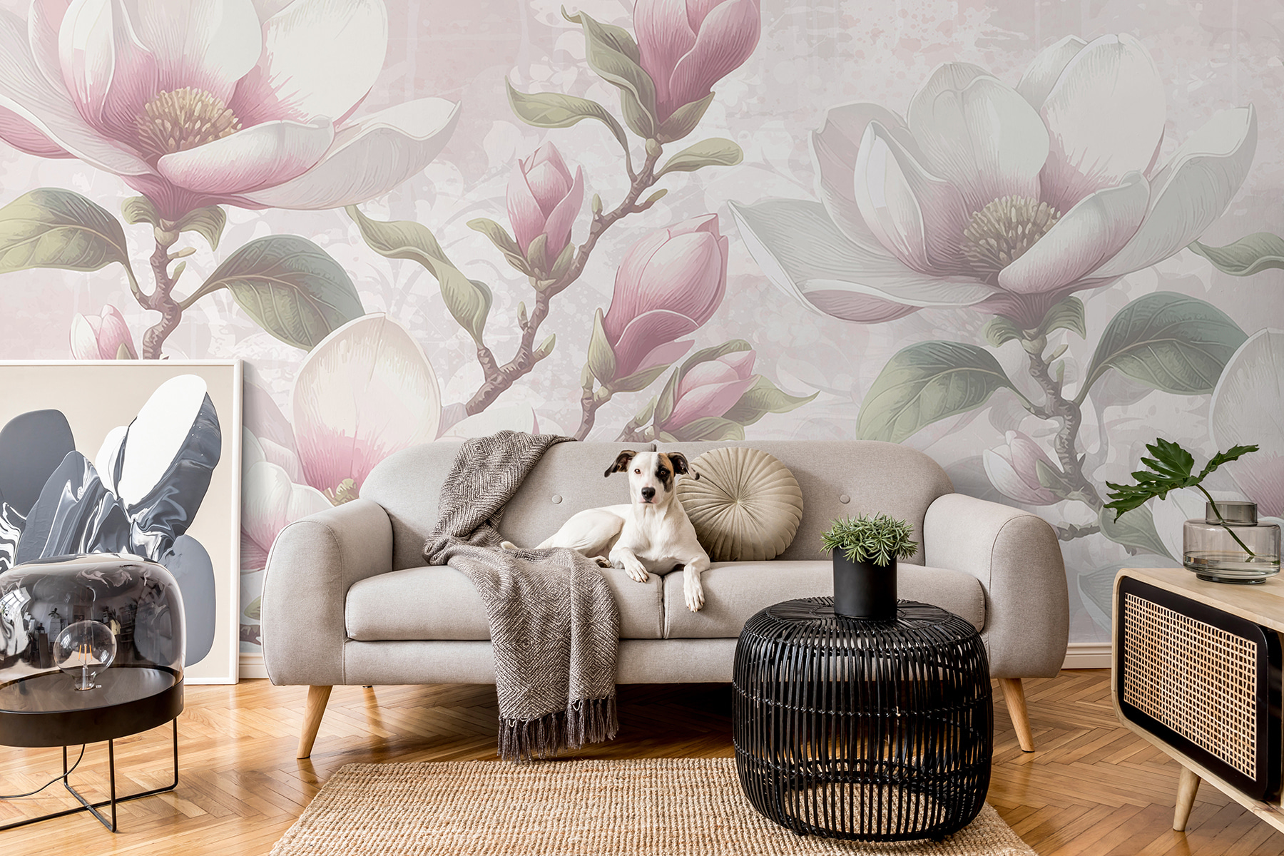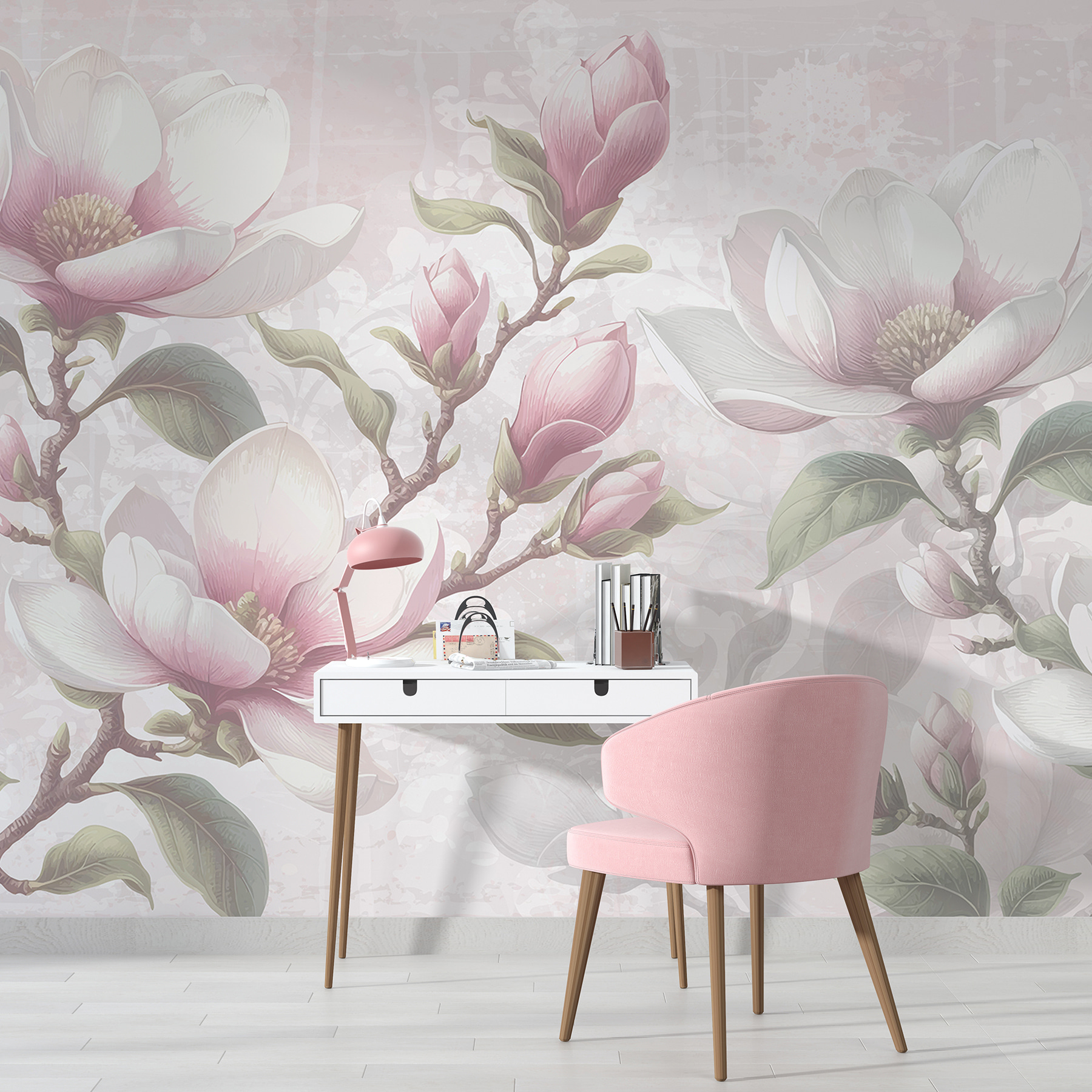 Transform your space with the “Elegant Magnolias in Bloom” mural, where nature’s beauty meets your walls. Picture waking up to delicate pink and white flowers, almost like they’re whispering sweet nothings as the sunlight dances across them. It’s like stepping into a serene garden right at home—perfect for curling up with a good book or sipping coffee while pretending to be extra sophisticated.