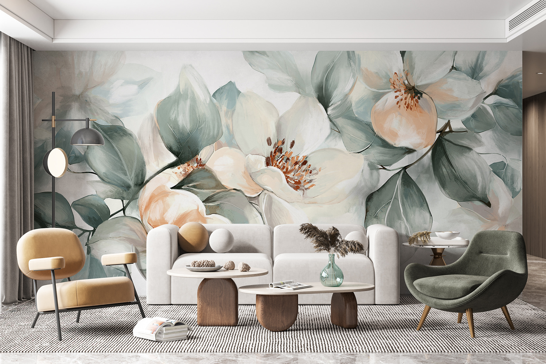 Brighten up any space with this stunning wall mural featuring delicate flowers and leaves. It’s like bringing a garden indoors, minus the sneezing! Imagine waking up to this beautiful sight every morning—the soft colors can make even Mondays feel a little lighter. Whether it’s in a cozy reading nook or a lively dining room, this mural adds a touch of nature’s charm. Perfect for those who want their walls to tell a story without saying a word. Plus, it’s a great conversation starter—because who doesn’t love a little floral gossip?