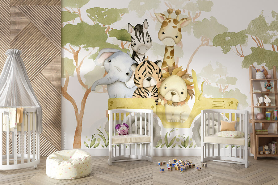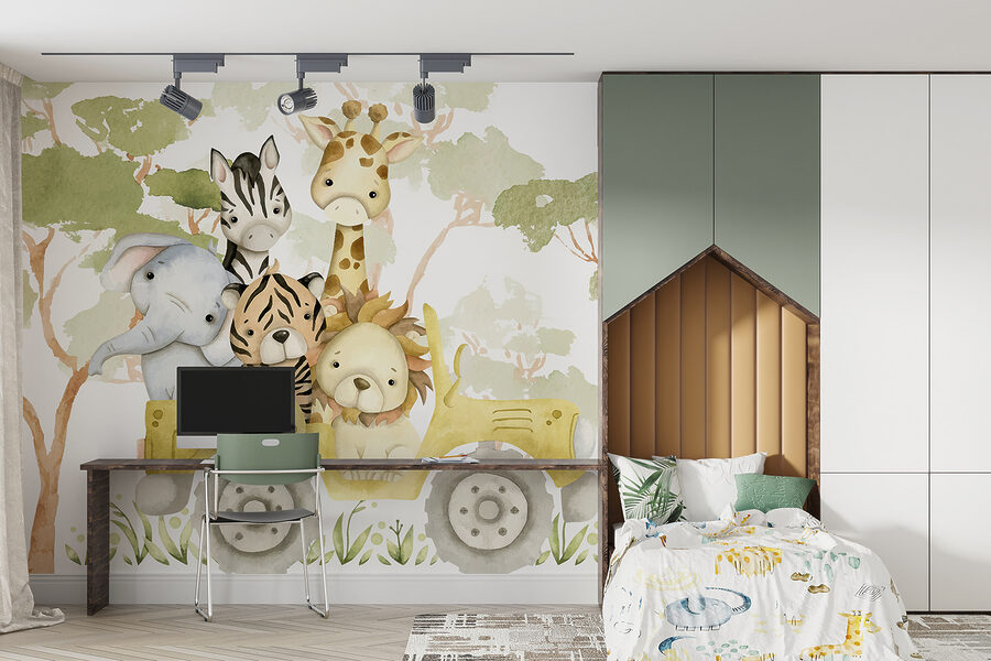 Transform a dull wall into a vibrant adventure zone with this whimsical mural featuring a bunch of cuddly animals packed into a cheerful little yellow truck. Just picture it—an adorable elephant, a mischievous tiger, and their pals rolling through an imaginary jungle. It’s hard not to smile, right? This piece isn’t just decor; it’s a daily dose of joy for kids and adults alike. The soft colors and playful vibe make it perfect for nurseries, playrooms, or any space that needs a sprinkle of fun. Each glance feels like stepping into a storybook—who wouldn’t want to join this wildlife road trip? Perfect for sparking imaginations and bringing a touch of nature indoors!