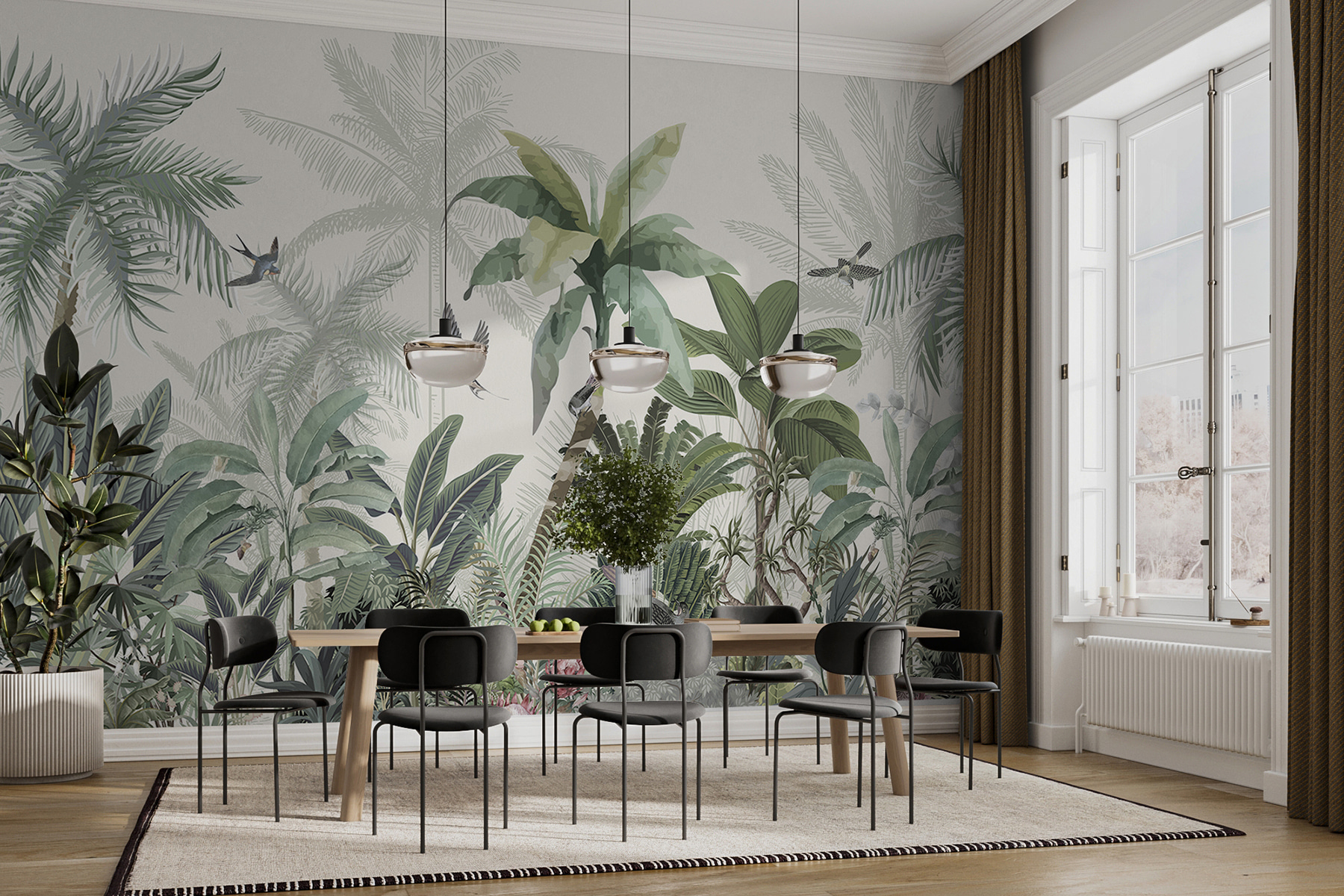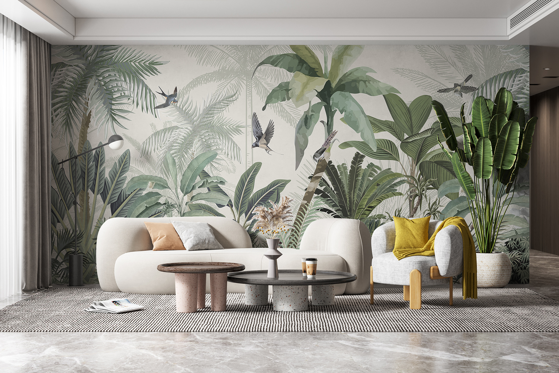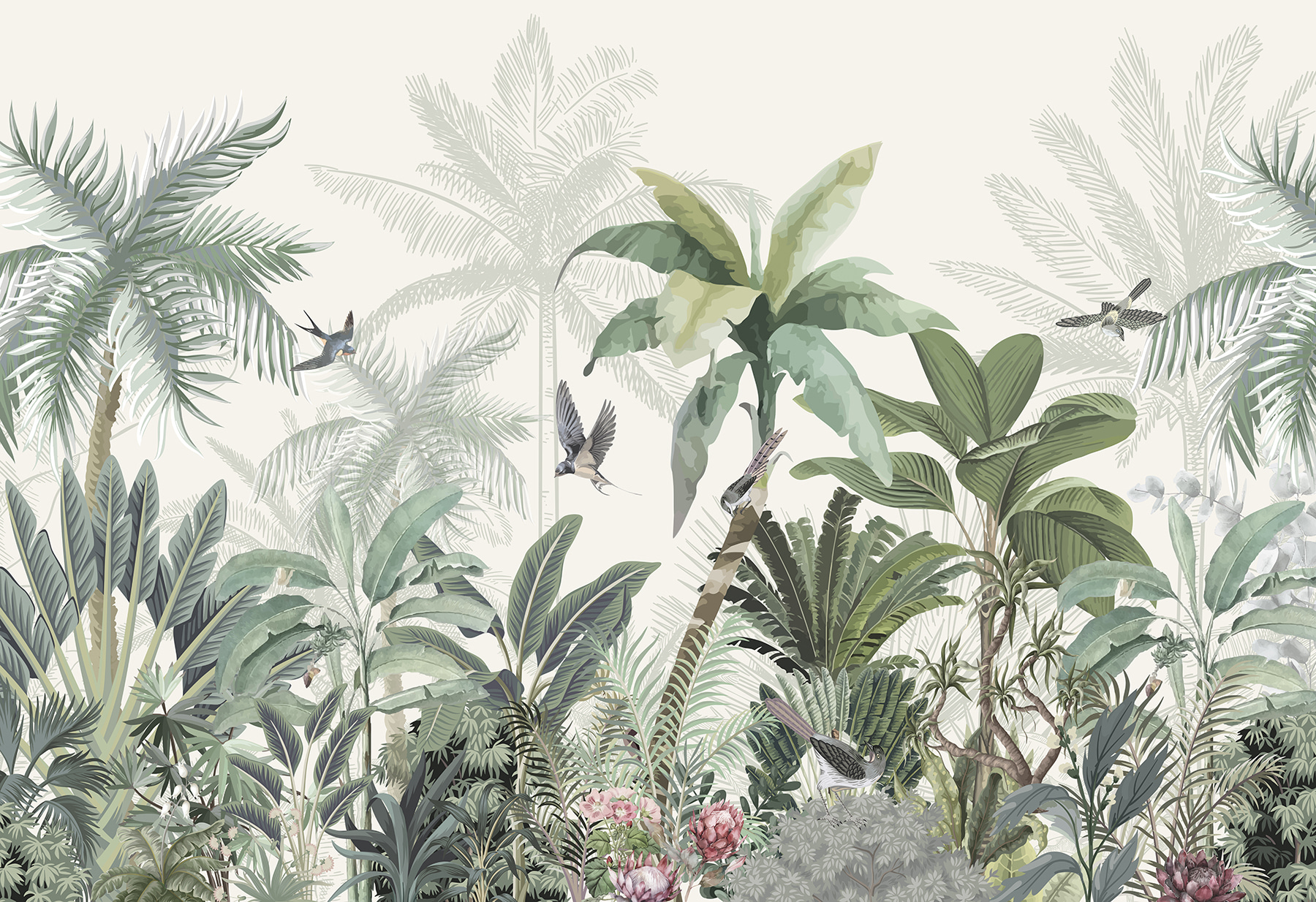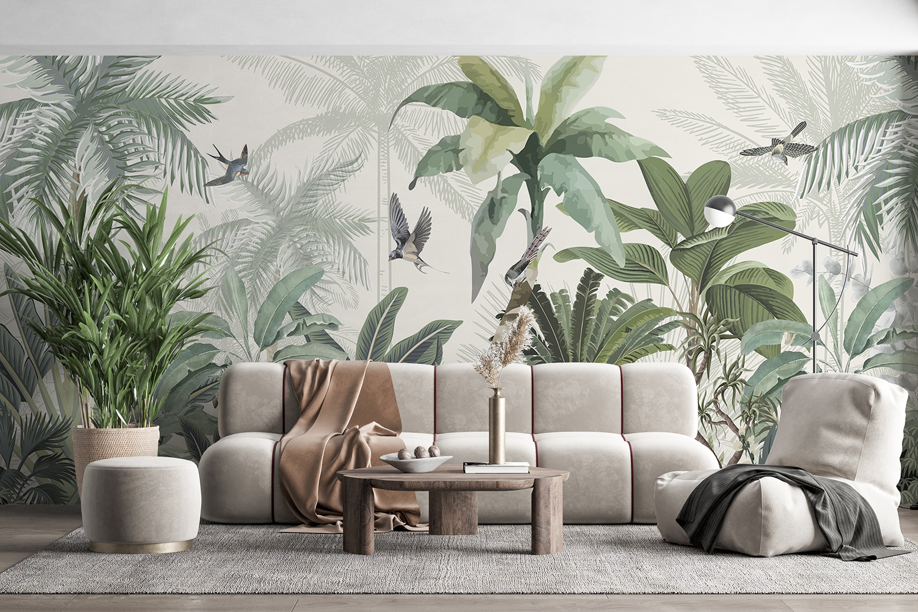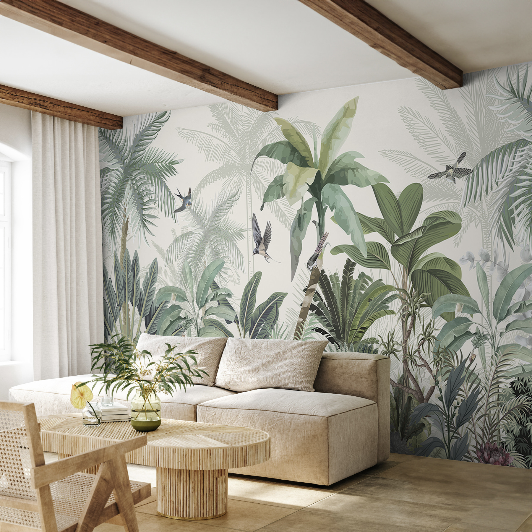 Transform your space with this vibrant wall mural that’s like a mini-vacation to the tropics. Picture lush green leaves, delicate flowers, and little birds soaring through the air—it’s a feast for the eyes! Imagine sipping a drink, surrounded by the scent of fresh greenery. This mural invites a sense of calm and adventure all at once. Perfect for a cozy reading nook or a lively living room, it brings nature indoors without the bugs. Give your walls a splash of life, and let the jungle vibes inspire your next gathering or quiet afternoon.