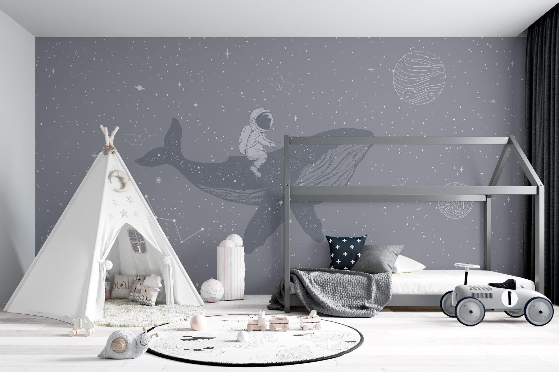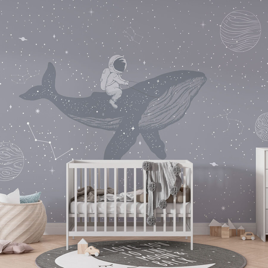 Transform your space with this whimsical wall mural featuring a person riding a whale through the cosmos! It’s like a dream wrapped in stardust—who wouldn’t want to chill with a massive whale among planets and constellations? It adds a touch of magic and a bit of nostalgia for childhood imaginations. Picture sinking into your favorite chair, sipping coffee, and letting your mind wander through the galaxies. This mural is not just decor; it’s a conversation starter, sparking joy and wonder. Perfect for a cozy living room, a creative workspace, or a dreamy bedroom. Dive into this unique vibe and let your walls tell a story!