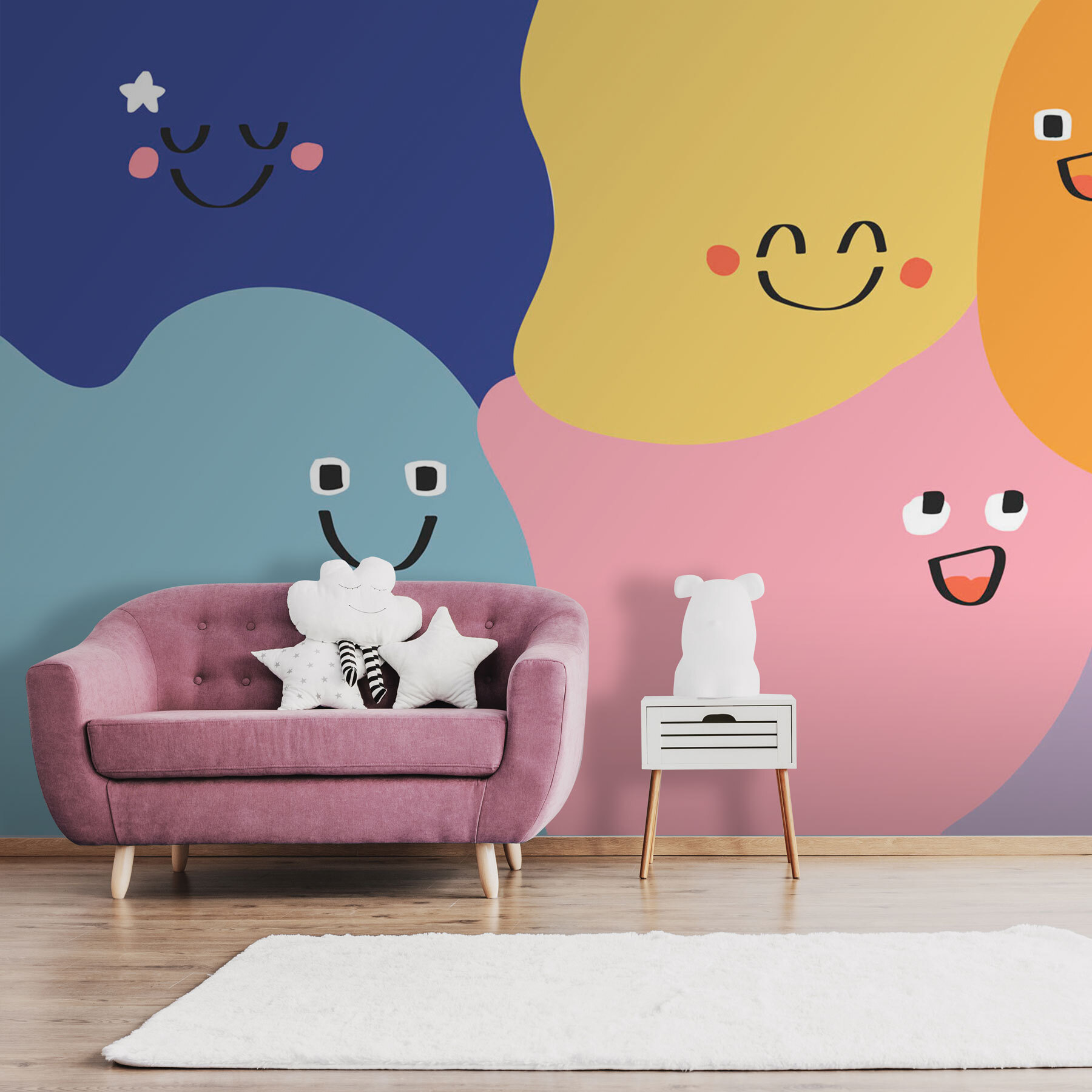 Meet the wall mural that’s here to brighten up any space with its playful, quirky charm. Imagine a parade of happy, colorful shapes all smiling and winking at you—who could resist that? This mural isn’t just a decoration; it brings an instant sense of joy and warmth. Perfect for a nursery or a cozy reading nook, you might find yourself grinning back at those cheerful faces. Whether it’s a gathering spot for little ones or a conversation starter for adults, it’s bound to spark smiles and maybe even a giggle or two. Give your walls a little character; they’ll thank you!