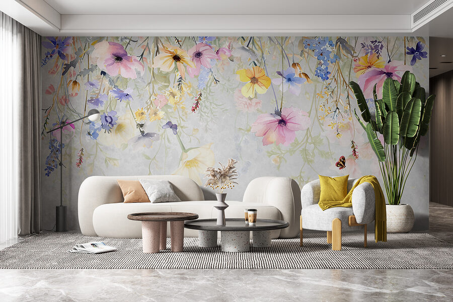 Transform any room into a whimsical garden with this enchanting wall mural featuring flowers and butterflies. Imagine waking up to a tapestry of vibrant blooms cascading from above, their colors flowing and dancing in a dreamy watercolor style. It invokes that delightful feeling of wandering through a sunlit meadow—highly therapeutic, right? The fluttering butterflies add just the right touch of magic, making it hard not to smile every time you walk by. Great for a cozy living space or a playful kid’s room, this mural brings nature indoors, sparking joy and creativity. Say goodbye to plain walls—who knew decor could feel so refreshing?